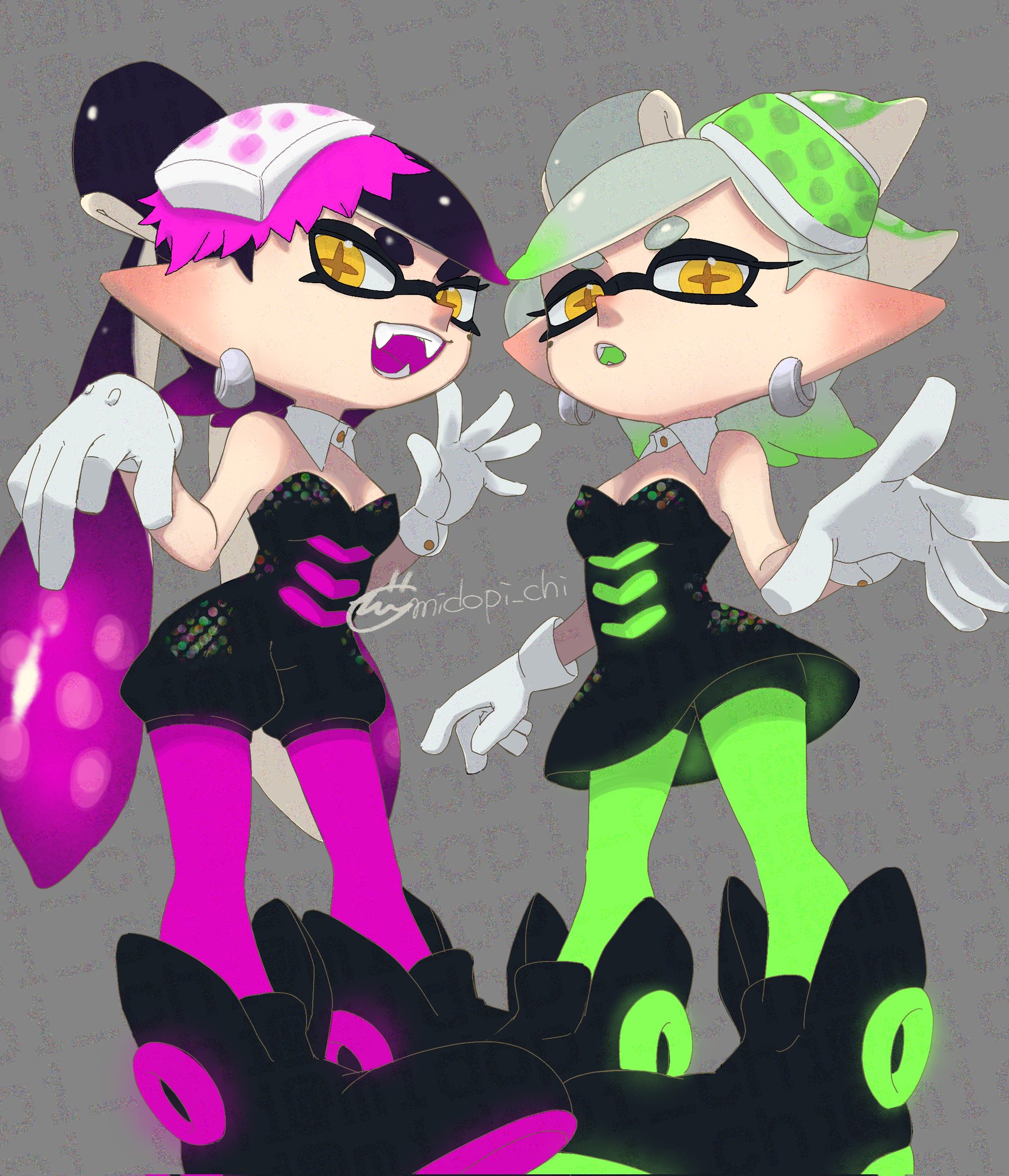 +_+ 2girls bare_arms black_dress black_hair black_jumpsuit black_unitard bow-shaped_hair breasts callie_(splatoon) callie_(squid_sisters_outfit)_(splatoon) cousins detached_collar dress fangs food food_on_head gradient_hair green_pantyhose grey_hair half_updo highres inkling jumpsuit long_hair marie_(splatoon) marie_(squid_sisters_outfit)_(splatoon) midopi_chi mole mole_under_eye multicolored_hair multiple_girls nintendo object_on_head open_mouth pantyhose pantyhose_under_shorts pointy_ears short_dress short_hair short_jumpsuit shorts shorts_under_dress smile splatoon_(series) strapless strapless_dress strapless_jumpsuit sushi swept_bangs tentacle_hair thick_eyebrows twintails yellow_eyes