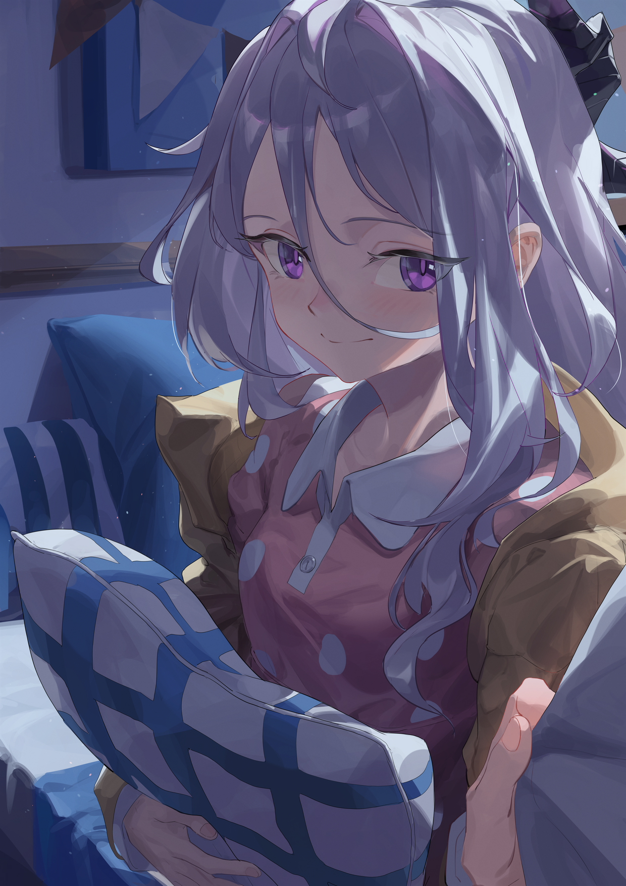 1girl ahoge alternate_costume alternate_hairstyle bed bedroom blue_archive blush breasts closed_mouth collarbone demon_girl demon_horns highres hina_(blue_archive) hina_(pajamas)_(blue_archive) holding holding_pillow horns indoors jacket long_hair looking_at_viewer newnand night official_alternate_costume pajamas pillow pink_pajamas polka_dot polka_dot_pajamas purple_eyes shadow sitting small_breasts solo white_hair yellow_jacket