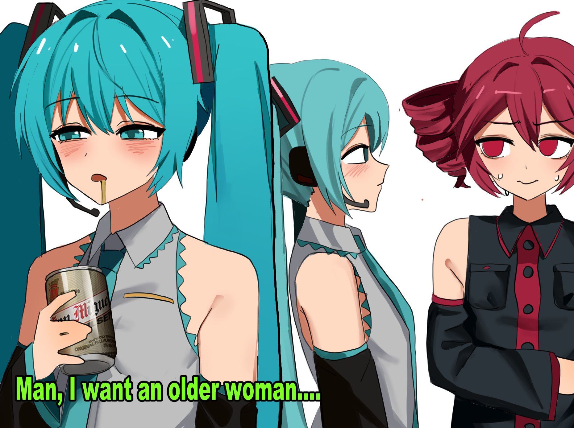 2girls ahoge animal_ears bare_shoulders beer_can black_shirt black_sleeves blue_hair blue_necktie blue_trim blush breast_pocket buttons can cat_ears collared_shirt detached_sleeves double-parted_bangs drill_hair drink_can drunk dual_persona from_side hair_between_eyes hatsune_miku headphones headset highres holding holding_can kasane_teto kasane_teto_(utau) microphone multiple_girls mykokampfwagen necktie open_mouth pocket red_eyes red_hair red_trim shirt side_drill simple_background sleeveless sleeveless_shirt solid_oval_eyes twintails utau vocaloid white_background wing_collar