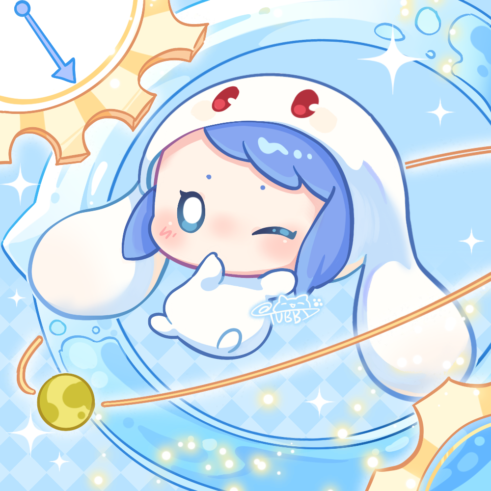 1girl blue_eyes blue_hair blush chibi gears looking_at_viewer maodou_wawa_(roco_kingdom:_world) one_eye_closed planet roco_kingdom roco_kingdom:_world short_bangs shun_zhi_yuanwei_ji signature solo sparkle