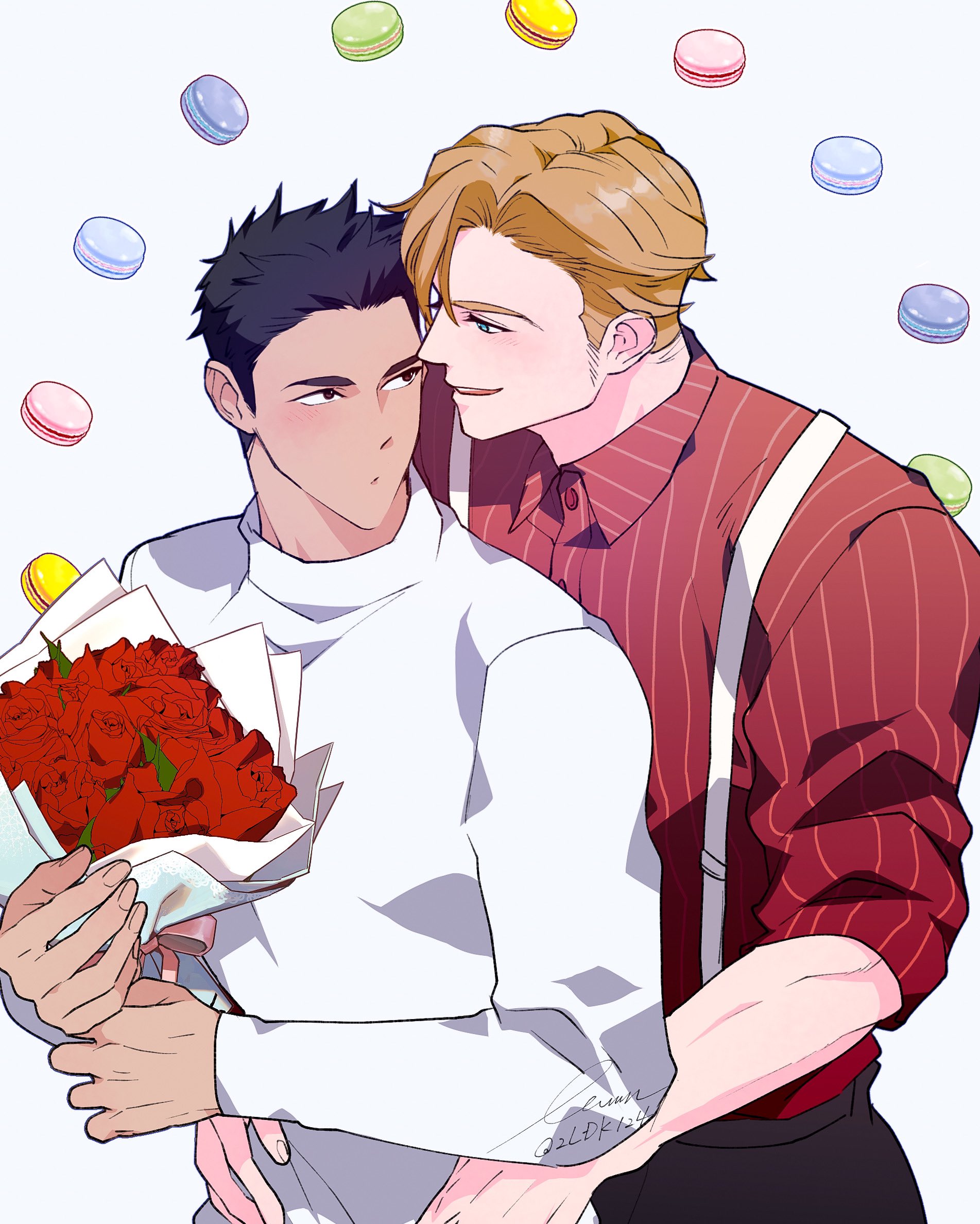 2boys ao_isami black_hair blonde_hair blue_eyes bouquet commentary_request facial_hair flower food highres holding holding_bouquet lewis_smith llld_(2ldk1241) macaron male_focus multiple_boys official_alternate_costume parted_lips red_flower red_rose red_shirt rose shirt short_hair sideburns_stubble signature striped_clothes striped_shirt stubble suspenders twitter_username vertical-striped_clothes vertical-striped_shirt yaoi yuuki_bakuhatsu_bang_bravern