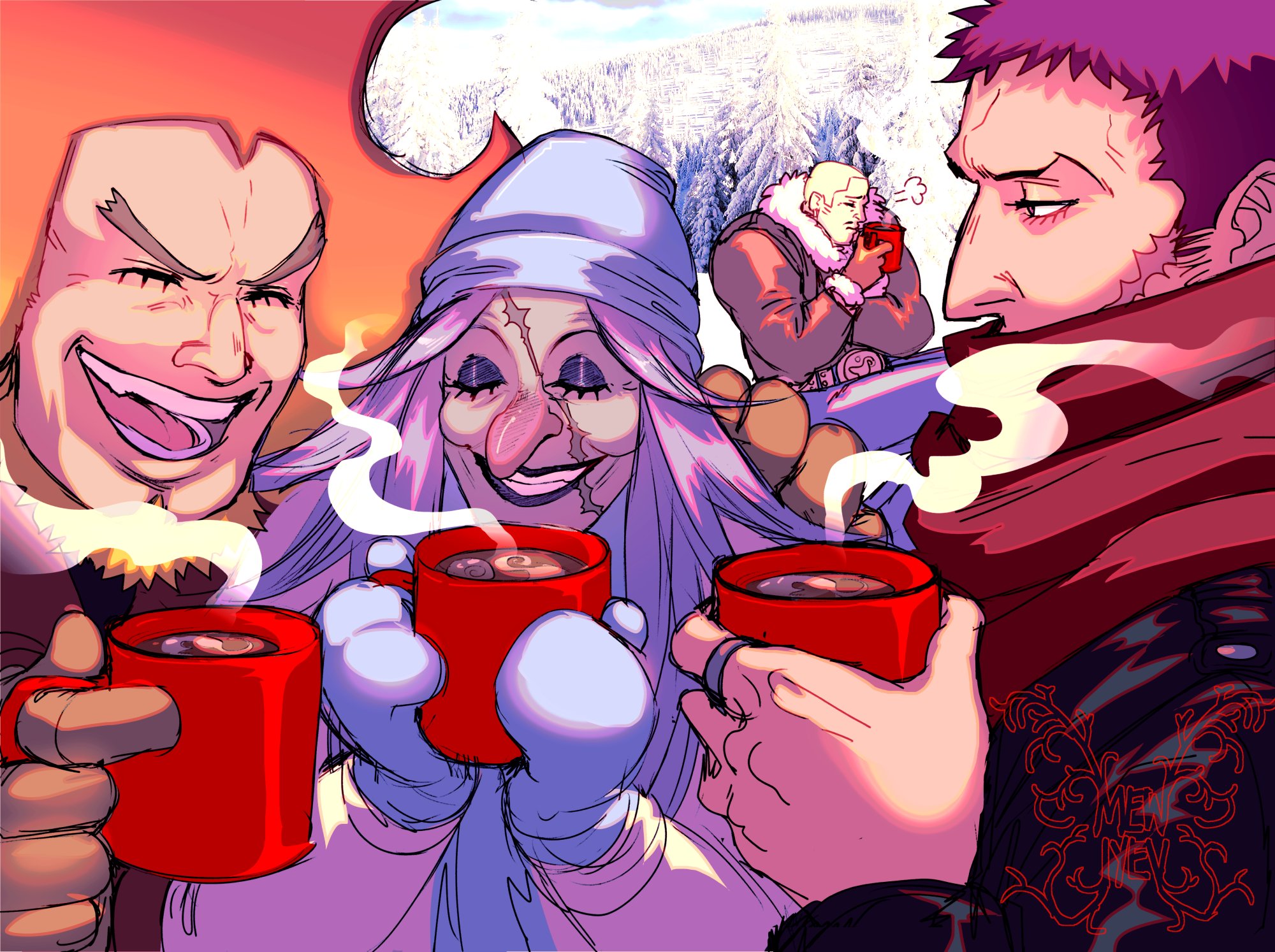 1girl 3boys alternate_costume artist_logo beard big_hair blonde_hair brother_and_sister brothers buzz_cut charlotte_brulee charlotte_daifuku charlotte_katakuri charlotte_oven commentary covered_mouth cup day drink english_commentary facial_hair facing_another grin hat height_difference highres holding holding_cup hot_chocolate jacket jewelry logo long_hair long_nose long_sleeves looking_at_another mewiyev mittens multiple_boys one_piece orange_hair outdoors photo_background purple_hair ring scar scar_on_face scar_on_mouth scarf scarf_over_mouth short_hair siblings smile snow steam very_short_hair winter winter_clothes