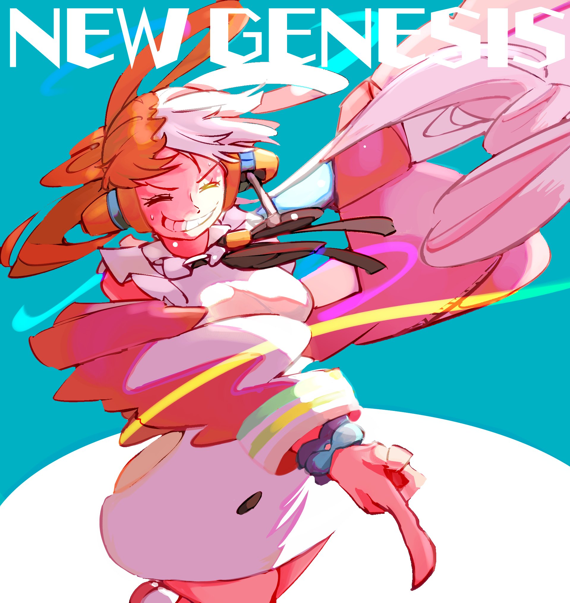 aqua_background asymmetrical_sleeves behind-the-head_headphones black_ribbon bracelet breasts closed_eyes cowboy_shot dress frills from_above gekidan183 grin headphones highres jacket jewelry legs_together medium_breasts multicolored_hair neck_ribbon one_piece one_piece_film:_red pink_jacket pointing red_hair ribbon sidelighting smile spinning standing sweat two-tone_background two-tone_hair uta_(one_piece) v-shaped_eyebrows white_background white_dress white_hair