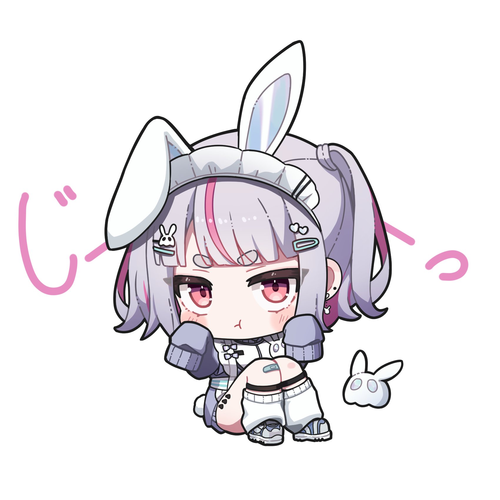 1girl :t angry animal_ears apron bandaid bandaid_on_knee bandaid_on_leg blue_footwear chibi closed_mouth dress fake_animal_ears fake_tail full_body hair_ornament hairclip hand_up heart heart_hair_ornament highres jersey_maid kiwipodo knees_up legwear_garter looking_at_viewer maid maid_headdress multicolored_hair pink_eyes pink_hair pink_streaks purple_dress purple_hair rabbit_ears rabbit_hair_ornament rabbit_tail short_eyebrows simple_background sitting skull_hair_ornament sleeves_past_wrists socks solo streaked_hair tail tosaki_mimi tosaki_mimi_(4th_costume) twintails unconventional_maid v-shaped_eyebrows virtual_youtuber vspo! white_apron white_background white_headdress white_socks