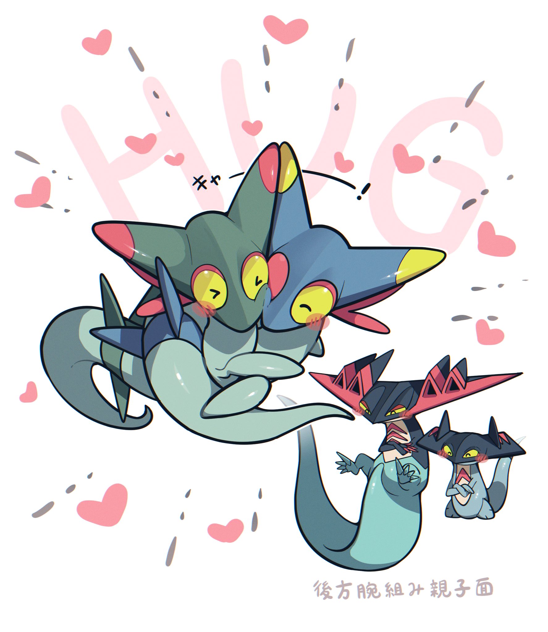 aru_(citrine_drplt) black_eyes blush colored_sclera crossed_arms dragapult drakloak dreepy floating gen_8_pokemon heart highres hug multiple_others nintendo pokemon pokemon_(creature) tail yellow_sclera