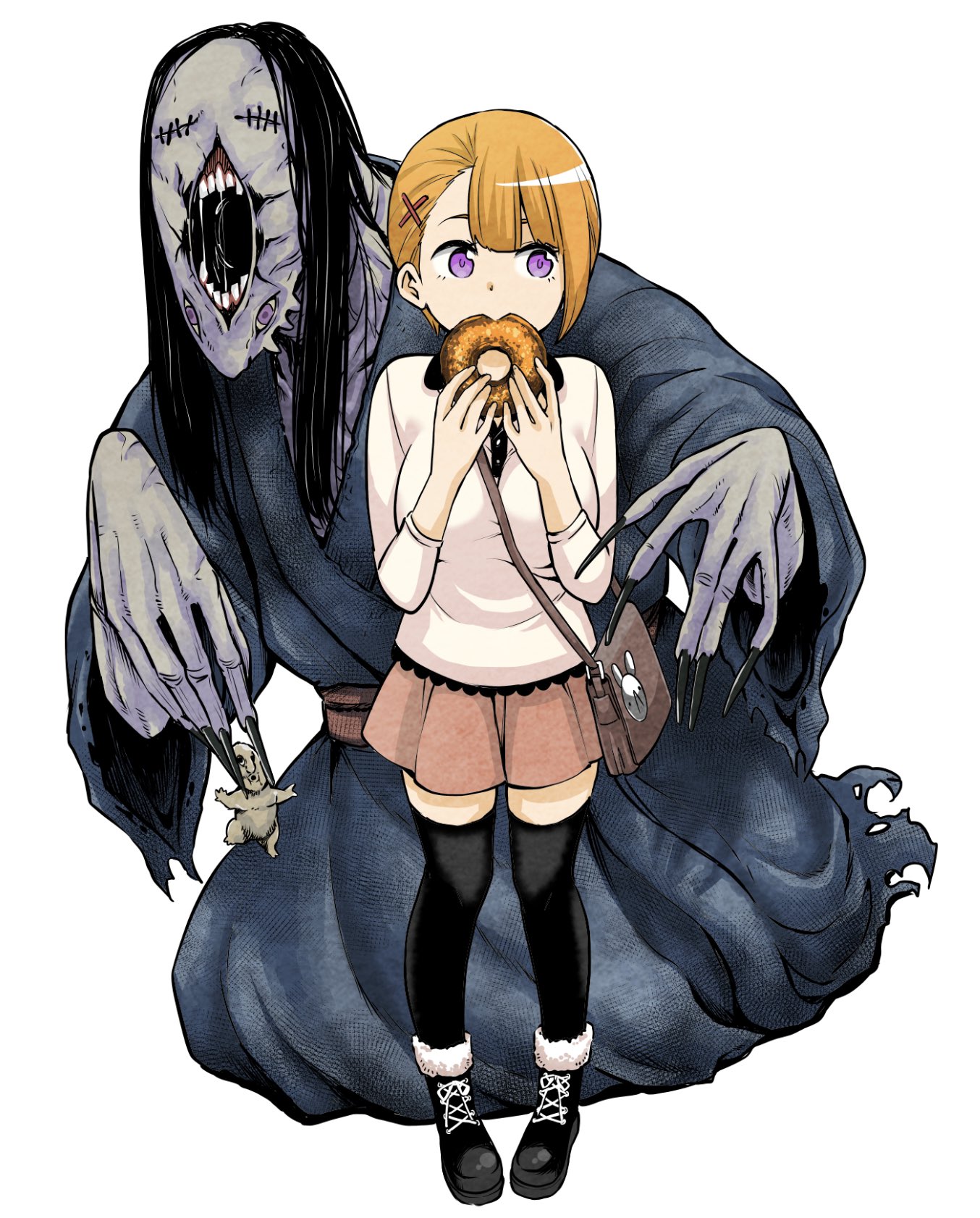 1girl 1other bag behind_another black_footwear black_hair black_robe black_thighhighs boots breasts brown_bag casual collared_shirt commentary_request donut eating food full_body fur-trimmed_boots fur_trim hair_ornament highres horror_(theme) izumi_(toubun_kata) large_breasts long_hair long_sleeves mieruko-chan monster open_mouth orange_hair pink_shirt purple_eyes red_skirt robe shirt short_hair shoulder_bag simple_background skirt standing stitched_eye thighhighs white_background x_hair_ornament yurikawa_hana