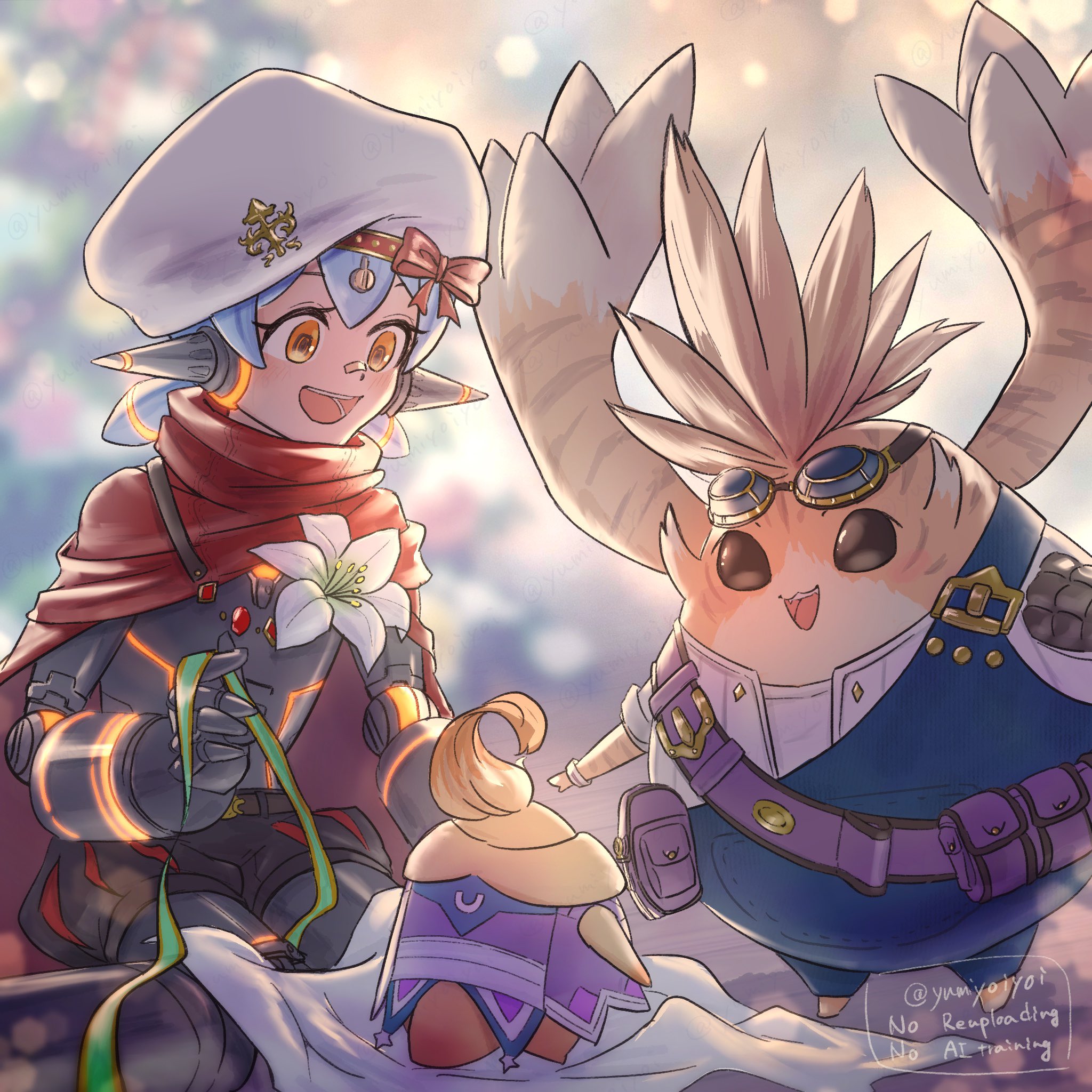 1girl android artist_name belt belt_pouch beret blue_hair bow brown_fur cape character_request commentary_request eyelashes flower goggles goggles_on_head hat hat_bow highres joints looking_at_another nopon open_mouth poppi_(xenoblade) pouch red_bow red_cape robot_joints smile tora_(xenoblade_2) twitter_username white_flower white_hat xenoblade_chronicles_(series) xenoblade_chronicles_2 yellow_eyes yumiyoiyoi