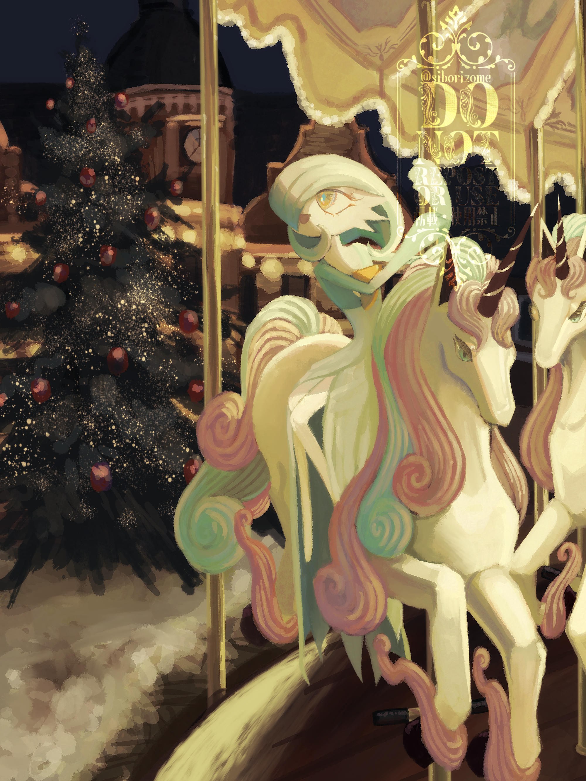 1girl absurdres alternate_color arms_up artist_name blue_hair blue_skin bob_cut carousel christmas christmas_ornaments christmas_tree colored_skin female_focus flat_chest galarian_form galarian_rapidash gardevoir gen_3_pokemon gen_8_pokemon hair_over_one_eye happy highres holding holding_pole knees_together_feet_apart looking_afar multicolored_skin night nintendo one_eye_covered open_mouth orange_eyes outdoors pokemon pokemon_(creature) pole shiny_pokemon short_hair sidesaddle smile solo tree twitter_username two-tone_skin watermark white_skin yuhata_(yuh4t4)