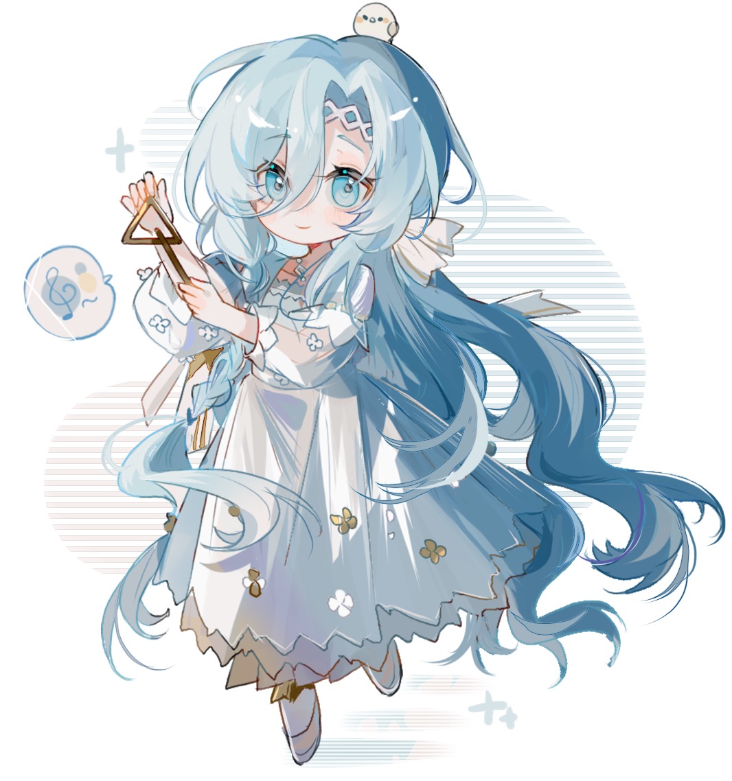 1girl 37_(reverse:1999) animal animal_on_head bird bird_on_head blue_eyes blue_hair closed_mouth deformed dress full_body hair_between_eyes hair_ribbon hands_up holding holding_stick instrument long_dress long_hair long_sleeves looking_at_viewer musical_note official_alternate_costume on_head puffy_long_sleeves puffy_sleeves reverse:1999 ribbon see-through_clothes see-through_sleeves smile solo spoken_musical_note standing stick treble_clef triangle_(instrument) very_long_hair wavy_hair white_background white_dress white_footwear white_ribbon zhizhi_(surri79797)