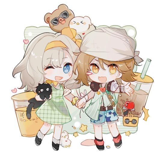 2girls :d ;d animal apple apple_(reverse:1999) bird black_cat black_footwear blue_eyes blue_shorts bow brown_hair bubble_tea cat chibi cup disposable_cup dress drinking_straw duck food fruit green_dress green_shirt grey_hair grid_print hair_bow hairband hand_up headphones headphones_around_neck headscarf holding holding_animal holding_hands lion_cub looking_at_viewer matilda_bouanich medium_hair multiple_girls official_alternate_costume one_eye_closed open_mouth orange_eyes red_socks regulus_(reverse:1999) reverse:1999 shirt short_hair short_sleeves shorts smile socks standing star_(symbol) white_background white_socks yellow_bow yellow_hairband zhizhi_(surri79797)
