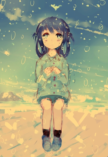 1girl archived_source bad_link bad_source black_socks blue_eyes blue_hair blue_shoes blue_skirt blue_sky closed_mouth cloud day folded_hair folded_twintails long_hair long_sleeves looking_up mountain nagi_no_asukara ocean own_hands_together scenery shiodome_miuna shoes sitting skirt sky socks solo source_request tears third-party_source travel twintails water_drop