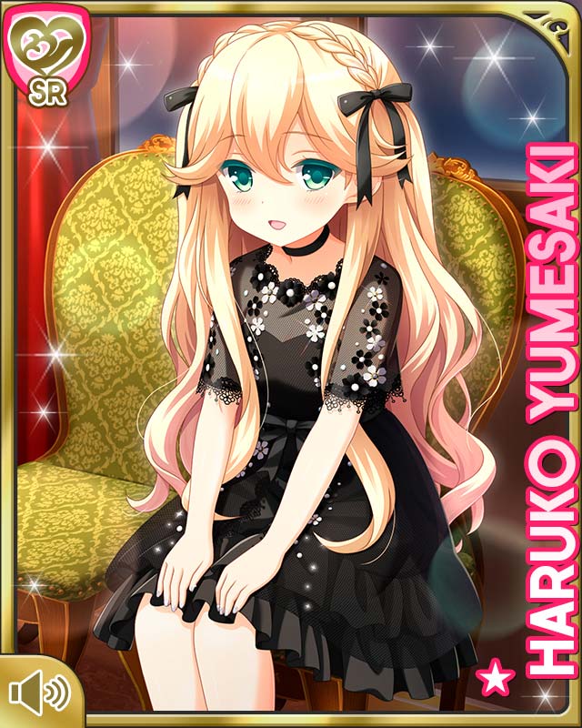 1girl :d alternate_hairstyle back_bow bare_legs black_bow black_dress blonde_hair bow character_name dress girlfriend_(kari) green_eyes indoors long_hair mansion night official_art open_mouth qp:flapper sitting smile tagme yumesaki_haruko