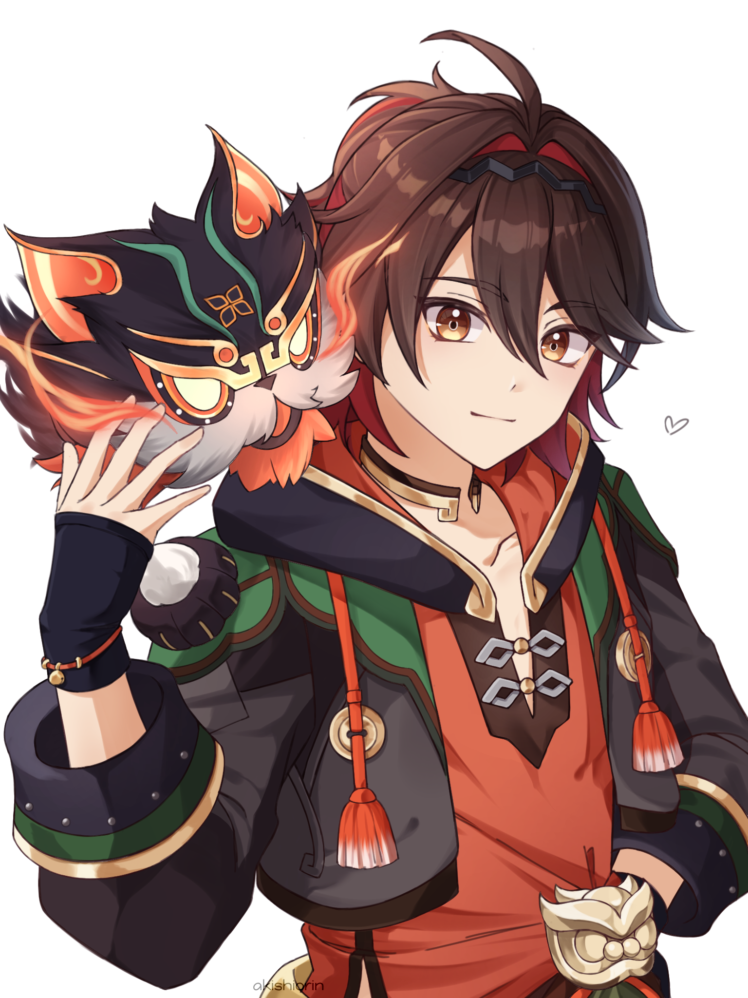 1boy akishiorin black_gloves black_hoodie black_jacket brown_eyes brown_hair closed_mouth fingerless_gloves gaming_(genshin_impact) genshin_impact gloves hair_between_eyes highres hood hooded_jacket hoodie jacket long_sleeves looking_at_viewer male_focus man_chai_(genshin_impact) multicolored_hair orange_shirt red_hair shirt smile solo tassel white_background