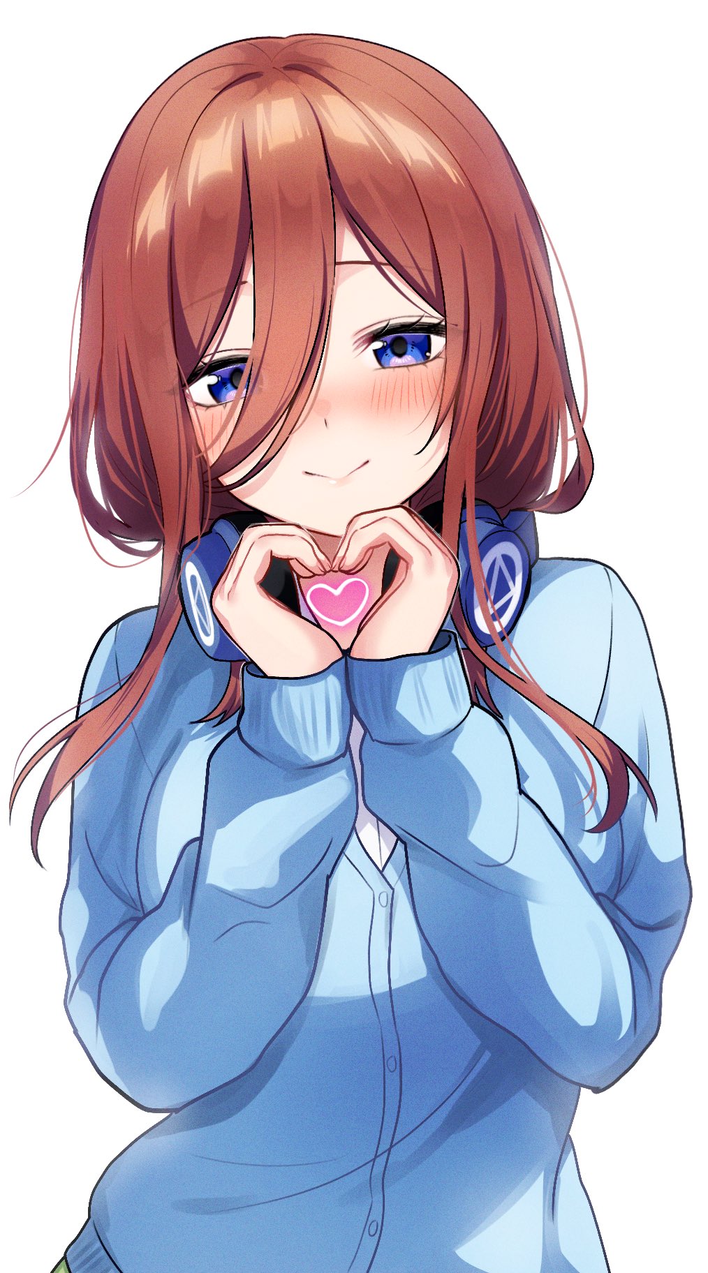 1girl blue_cardigan blue_eyes blush brown_hair cardigan closed_mouth go-toubun_no_hanayome hair_between_eyes headphones headphones_around_neck heart heart_hands highres kurosaki_coco long_hair long_hair_between_eyes long_sleeves looking_at_viewer nakano_miku shirt simple_background smile solo white_background