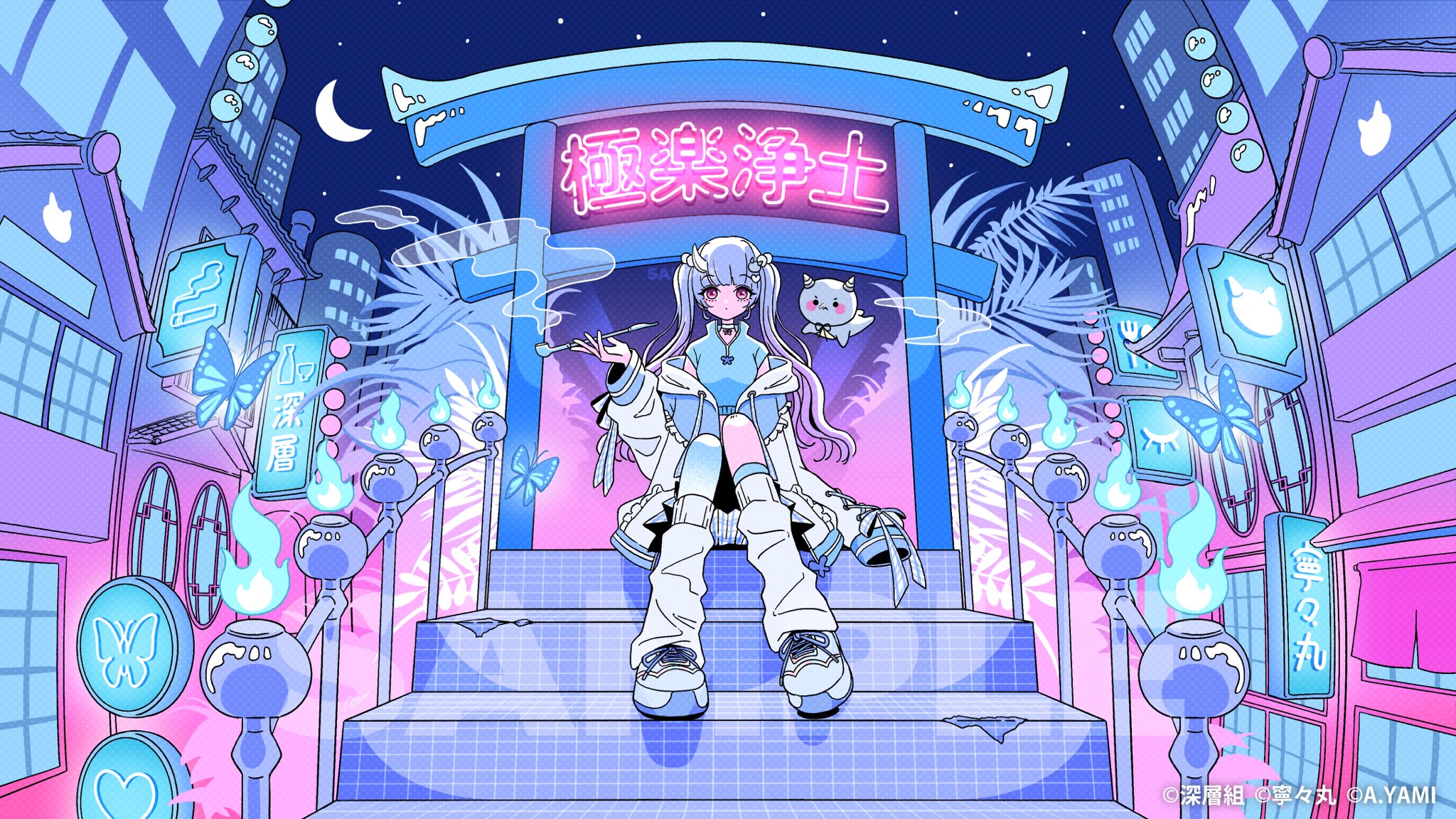 1girl blue_fire blue_hair bug busou_kanojo butterfly checkered_clothes checkered_ribbon checkered_skirt city city_lights cityscape closed_mouth crescent_moon dot_mouth fire frilled_jacket frills glowing_butterfly hair_ornament heart heart_hair_ornament highres holding holding_smoking_pipe horns insect jacket leg_warmers looking_at_viewer mascot moon multicolored_clothes nakazawa_ayami nenemaru_(busou_kanojo) neon_lights night pink_eyes shoes single_horn sitting sitting_on_stairs skirt sky smoking_pipe sneakers stairs tenshi_kaiwai torii turtleneck turtleneck_jacket twintails virtual_youtuber white_jacket white_shoes