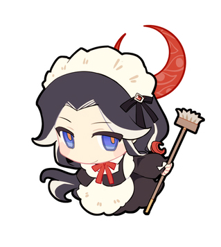 1girl apron black_bow black_dress black_hair blue_eyes blush_stickers bow bowtie character_request check_gender chibi closed_mouth collared_shirt colored_inner_hair crescent_moon dress gem gem_hair_ornament gender_request hair_bow holding holding_mop kaze_(starr-a) long_dress long_hair long_sleeves lord_of_the_mysteries low_ponytail lowres maid maid_headdress moon mop multicolored_hair orange_pupils ponytail puffy_long_sleeves puffy_sleeves red_bow red_bowtie red_gem red_moon shirt shirt_under_dress simple_background smile very_long_hair white_apron white_background white_hair white_shirt