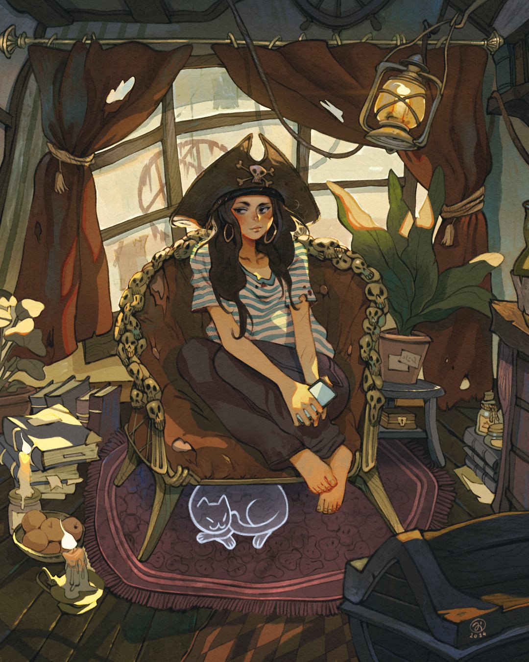 1girl aqua_shirt artist_logo barefoot black_hair blue_eyeshadow book bottle candle cat cellphone chair collarbone commentary curtains earrings english_commentary eyeshadow feet food fruit fruit_bowl ghost hat highres holding holding_phone hoop_earrings indoors jar jewelry lantern logo long_hair looking_to_the_side makeup on_chair orange_(fruit) original pants pentagram phone pirate_costume pirate_hat plant potted_plant rug runes shirt short_sleeves simz skull skull_and_crossbones slice_of_life smartphone solo striped_clothes striped_shirt thick_eyebrows toes torn_clothes torn_shirt treasure_chest window witch wooden_floor