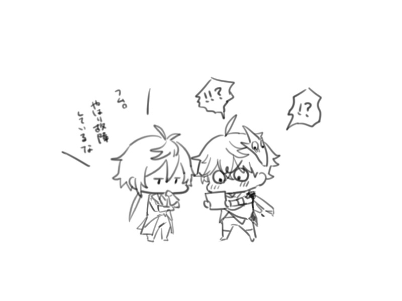 !? 2boys blush chibi genshin_impact gils3105 greyscale image_sample japanese_text monochrome multiple_boys pixiv pixiv_sample shocked_pupils speech_bubble tartaglia_(genshin_impact) white_background zhongli_(genshin_impact)