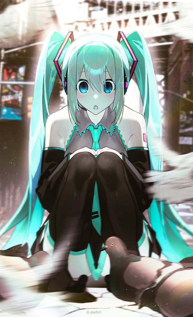 1girl aqua_eyes aqua_hair bare_shoulders bird blue_eyes detached_sleeves eungo hair_between_eyes hair_ornament hatsune_miku highres long_hair looking_at_viewer necktie open_mouth shirt skirt sleeveless solo thighhighs twintails very_long_hair vocaloid