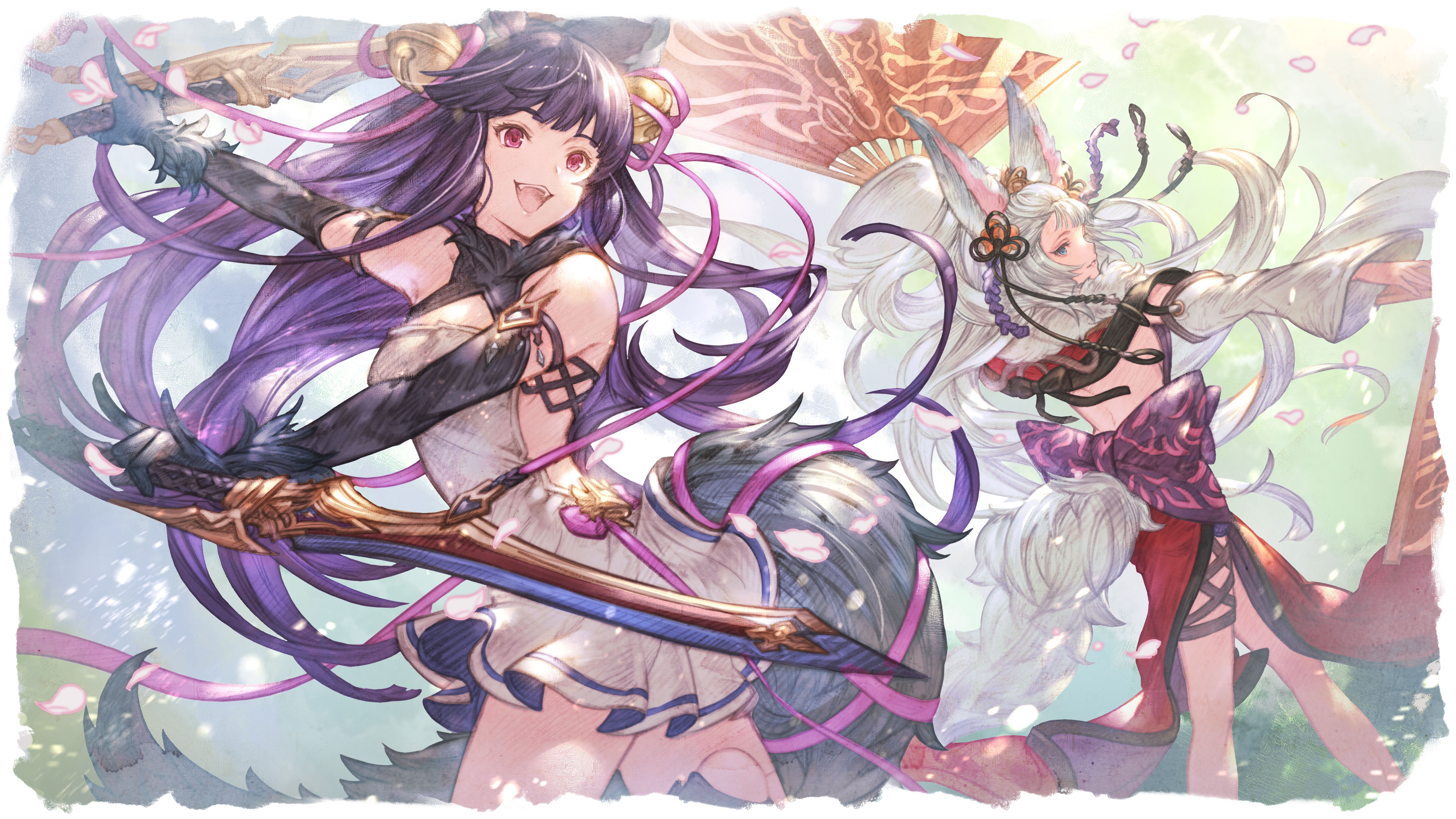 2girls :d absurdres animal_ears arm_up backless_dress backless_outfit bell black_gloves blue_eyes blunt_bangs bow breasts cowboy_shot detached_sleeves dress dress_bow elbow_gloves falling_petals fang floating_clothes floating_hair fox_ears fox_girl fox_tail fur-trimmed_dress fur_trim gloves granblue_fantasy granblue_fantasy_versus:_rising grass hair_bell hair_ornament hand_fan highres holding holding_sword holding_weapon large_breasts large_ears long_dress long_hair looking_at_viewer looking_back messy_hair minaba_hideo multiple_girls official_art open_mouth petals pink_eyes pink_petals pleated_dress red_dress sidelocks smile societte_(granblue_fantasy) sword tail thigh_strap third-party_source very_long_hair weapon white_dress white_hair yuel_(granblue_fantasy) yuel_(water)_(granblue_fantasy)