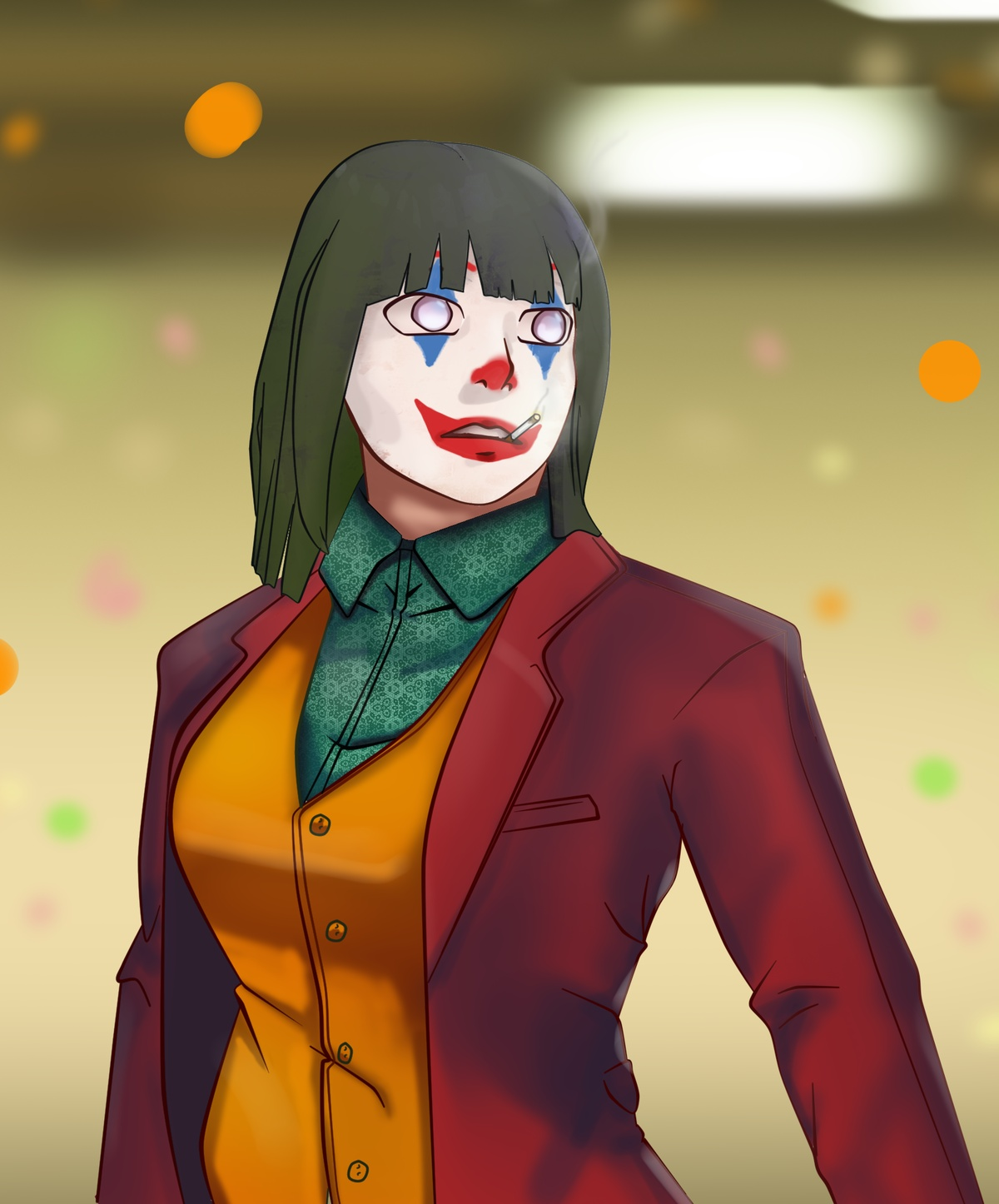 batman_(series) blue_hair boruto:_naruto_next_generations clown cosplay crossover dc_comics facepaint highres hyuuga_hinata jacket joker_(2019) joker_(dc)_(cosplay) mature_female naruto_(classic) naruto_(series) naruto_shippuuden non-web_source short_hair suit_jacket the_joker thedarkvictim white_eyes