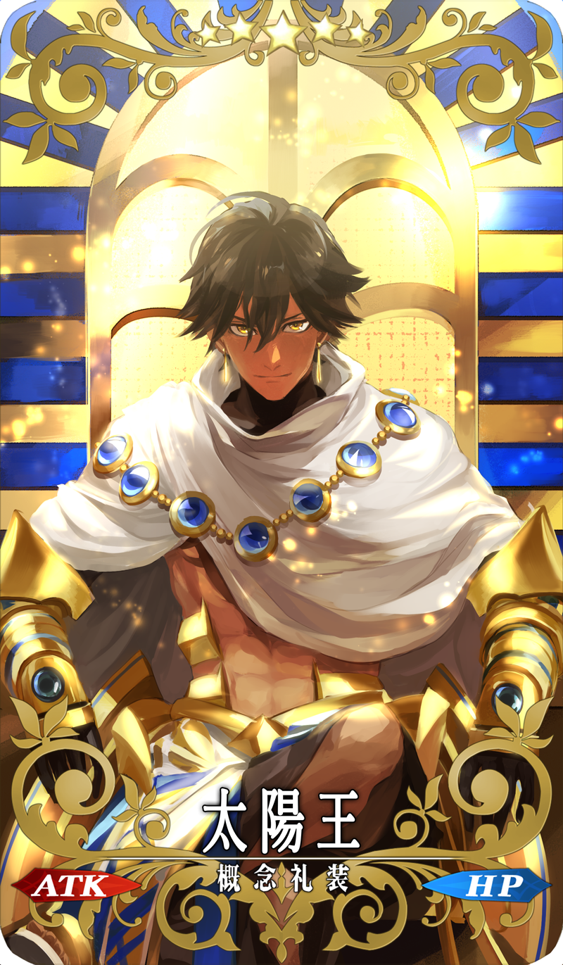 1boy abs ancient_egyptian black_hair card_(medium) card_parody closed_mouth craft_essence_(fate) earrings en_(enxxx) fate/grand_order fate_(series) gauntlets hair_between_eyes highres jewelry looking_at_viewer male_focus ozymandias_(fate) solo tan yellow_eyes