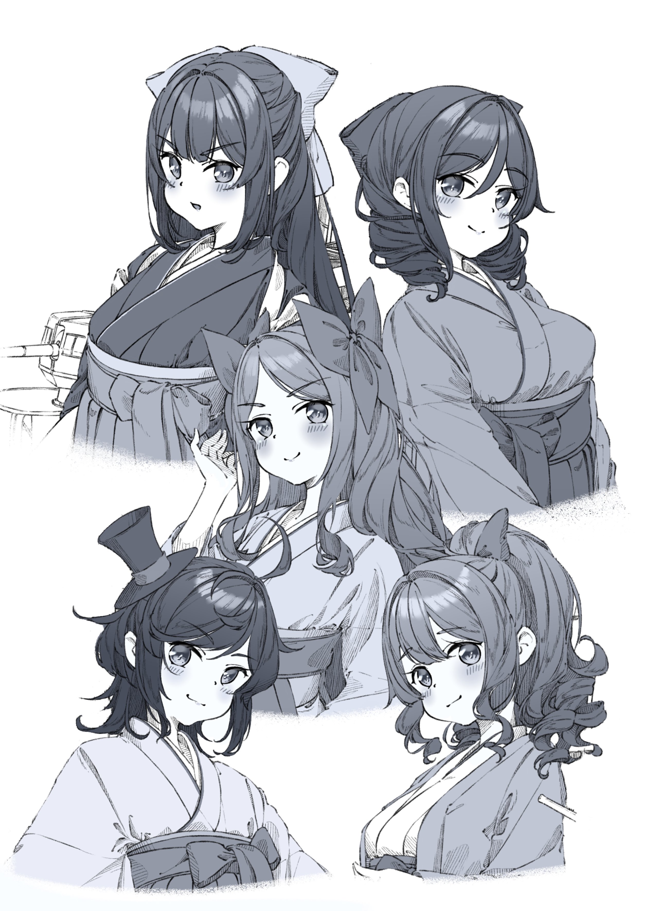 5girls absurdres asakaze_(kancolle) bow breasts commentary_request drill_hair greyscale hair_bow hakama harukaze_(kancolle) hat hatakaze_(kancolle) highres japanese_clothes kamikaze_(kancolle) kantai_collection kimono long_hair matsukaze_(kancolle) medium_breasts meiji_schoolgirl_uniform mini_hat mini_top_hat monochrome multiple_girls parted_bangs ponytail sagoromo_04 short_hair simple_background top_hat upper_body wavy_hair