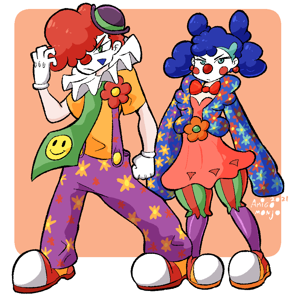 1boy 1girl 2021 blue_eyes blue_hair clown clown_nose drawfag facepaint full_body gladion_(pokemon) gloves green_eyes green_necktie hat marnie_(pokemon) necktie nintendo overalls pokemon pokemon_sm pokemon_swsh purple_hat purple_overalls red_hair sleeves_past_fingers sleeves_past_wrists smiley_face standing white_gloves