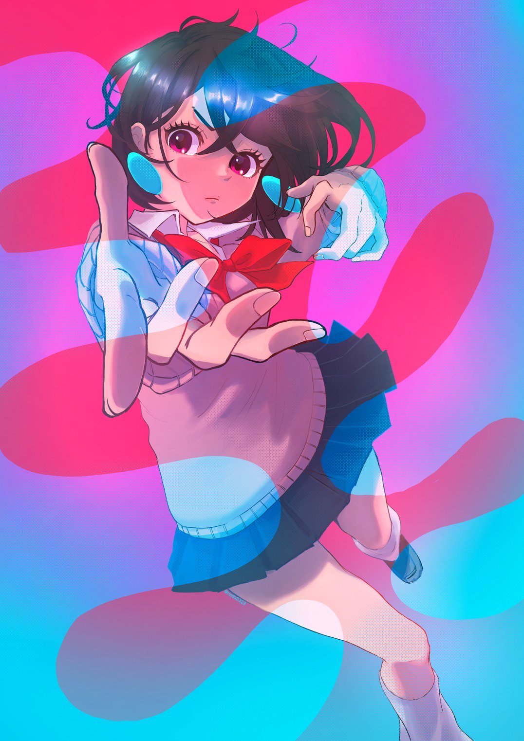 1girl ayase_momo blue_skirt bow bowtie brown_hair collared_shirt commentary dandadan earrings foot_out_of_frame gradient_background hair_between_eyes highres hoshirindo jewelry long_sleeves looking_at_viewer loose_bowtie loose_socks messy_hair miniskirt outstretched_arm pink_sweater pleated_skirt red_bow red_bowtie red_eyes school_uniform shirt short_hair skirt socks solo sweater white_shirt white_socks