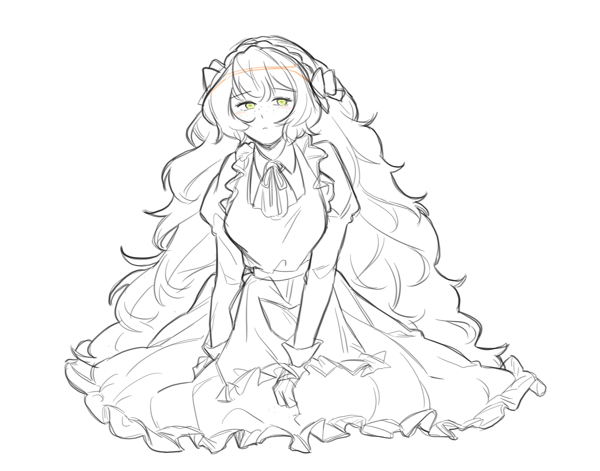 1girl apron ascot bow dress frilled_apron frilled_dress frills green_eyes greyscale hair_bow hairband highres ishmael_(project_moon) juliet_sleeves limbus_company long_hair long_sleeves monochrome neck_ribbon project_moon puffy_sleeves ribbon rope sidelocks simple_background solo spot_color very_long_hair wuthering_heights_(identity)_(project_moon) xo_clock