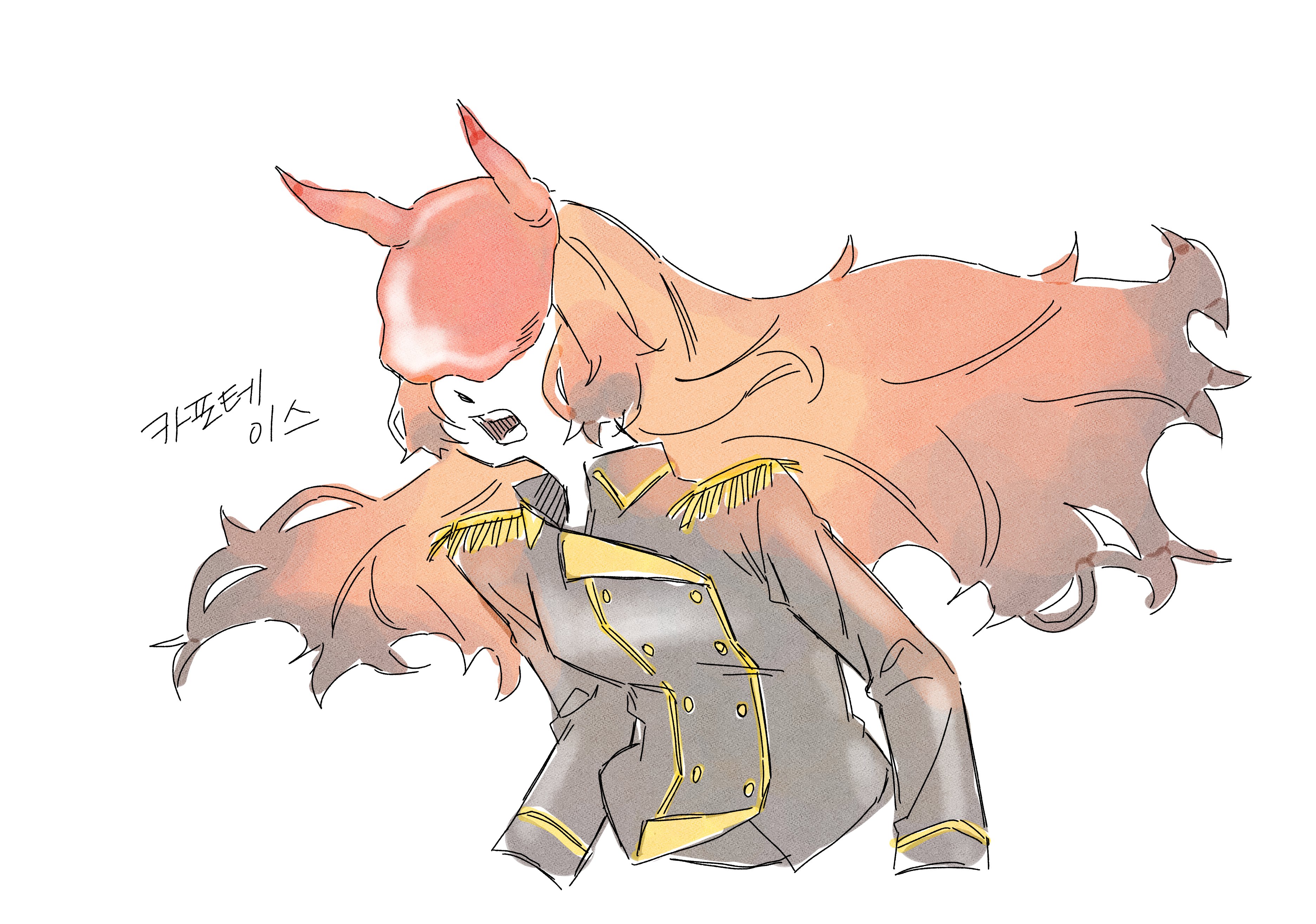 1girl absurdres black_jacket buttons capote_(e.g.o) covered_eyes double-breasted e.g.o_(project_moon) epaulettes highres ishmael_(project_moon) jacket korean_text limbus_company long_hair mask open_mouth orange_hair project_moon simple_background solo translation_request upper_body very_long_hair white_background xo_clock