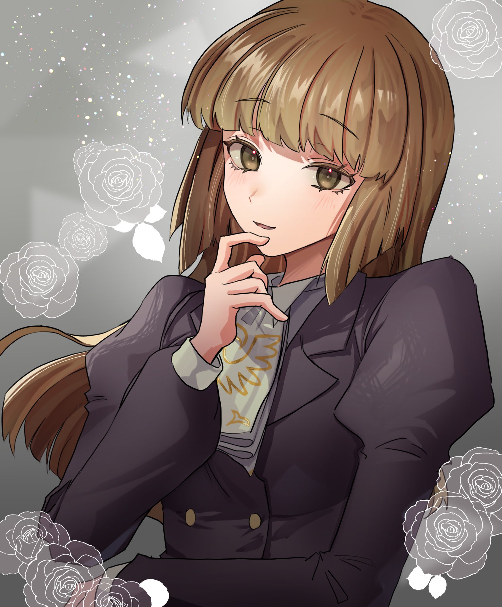 1girl ascot black_dress brown_eyes brown_hair dress floral_background flower hand_on_own_chin highres light_smile long_hair looking_at_viewer mature_female solo soresono88 umineko_no_naku_koro_ni ushiromiya_rosa white_ascot