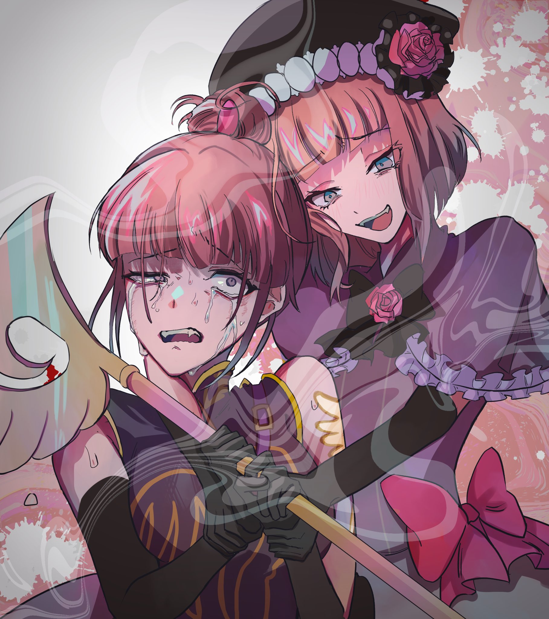 2girls black_gloves black_hat black_ribbon breasts brown_hair child china_dress chinese_clothes dress dual_persona eva_beatrice evil_smile flower gloves half-closed_eye hat highres mature_female medium_breasts medium_hair multiple_girls open_mouth purple_dress red_ribbon ribbon rose smile soresono88 sweat tears umineko_no_naku_koro_ni ushiromiya_eva wand