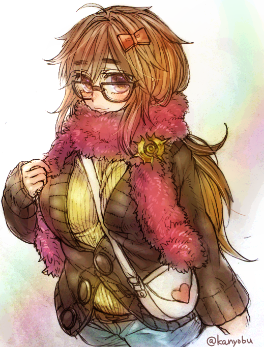 1girl bag black_cardigan bow breasts brown_hair cardigan commentary_request fate/extra fate/extra_ccc fate_(series) fur_scarf glasses hair_bow handbag jinako_carigiri kanyobu large_breasts plump red_eyes red_scarf ribbed_sweater scarf sleeves_past_wrists solo sweater twitter_username upper_body very_big_eyes yellow_sweater
