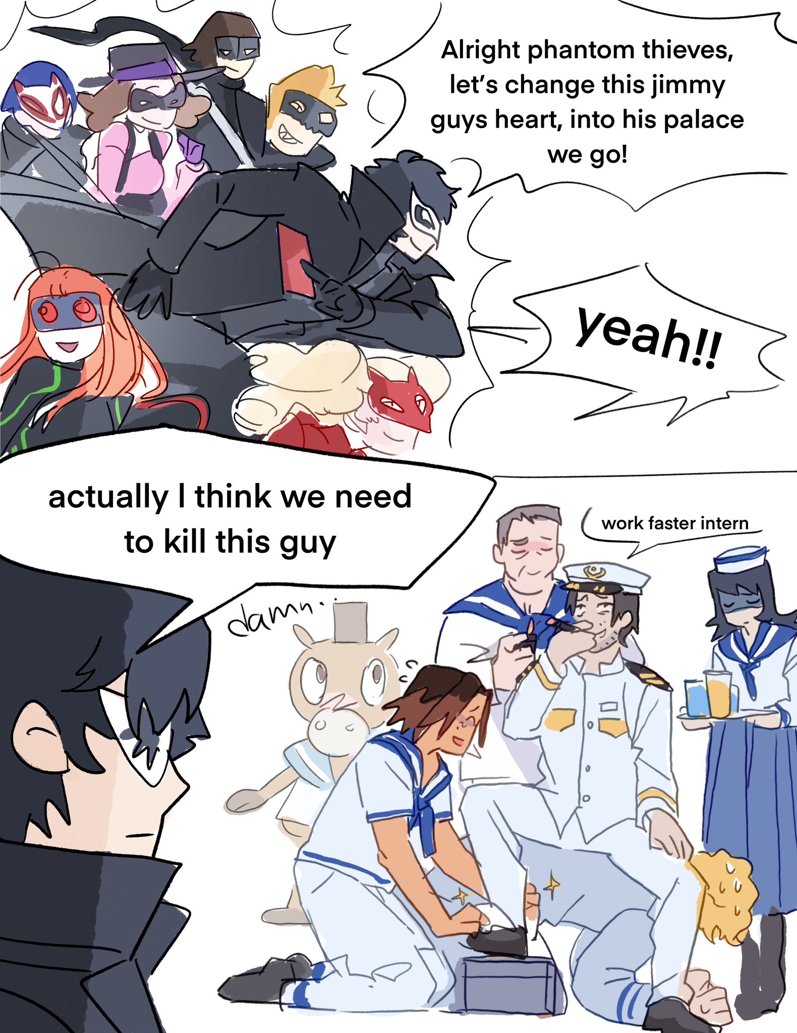 amamiya_ren anya_(mouthwashing) black_hair blonde_hair brown_eyes brown_hair curly_(mouthwashing) curly_(pre-crash)_(mouthwashing) daisuke_(mouthwashing) dule_(anhaidule) glasses gloves hat highres jimmy_(mouthwashing) joker_(persona_5) kitagawa_yuusuke long_hair long_sleeves male_focus mask mouthwashing niijima_makoto okumura_haru open_mouth persona persona_5 red_eyes sakamoto_ryuuji sakura_futaba shirt short_hair smile swansea_(mouthwashing) takamaki_anne