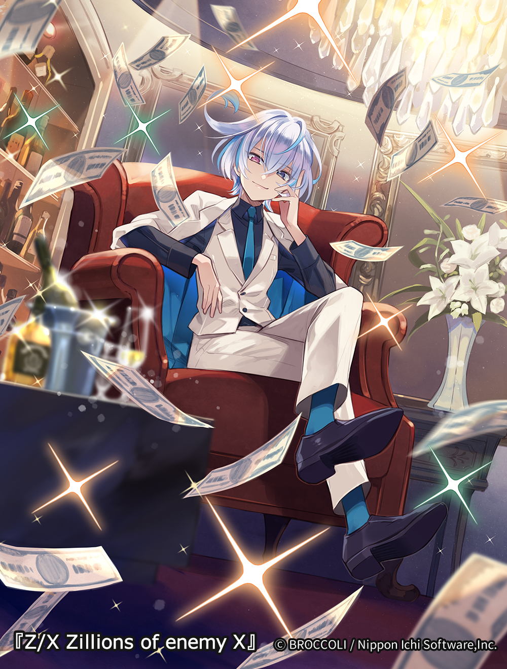 1boy banknote black_shirt black_shoes blue_hair blue_necktie blue_socks blurry blurry_foreground bottle chandelier character_request closed_mouth collared_shirt commentary_request copyright_name crossed_legs depth_of_field flower grey_eyes grey_hair hair_between_eyes heterochromia highres jacket jacket_on_shoulders male_focus money multicolored_hair necktie official_art pants purple_eyes shirt shoe_soles shoes sitting smile socks solo streaked_hair vase vest white_flower white_jacket white_pants white_vest yuko_(uc_yuk) z/x