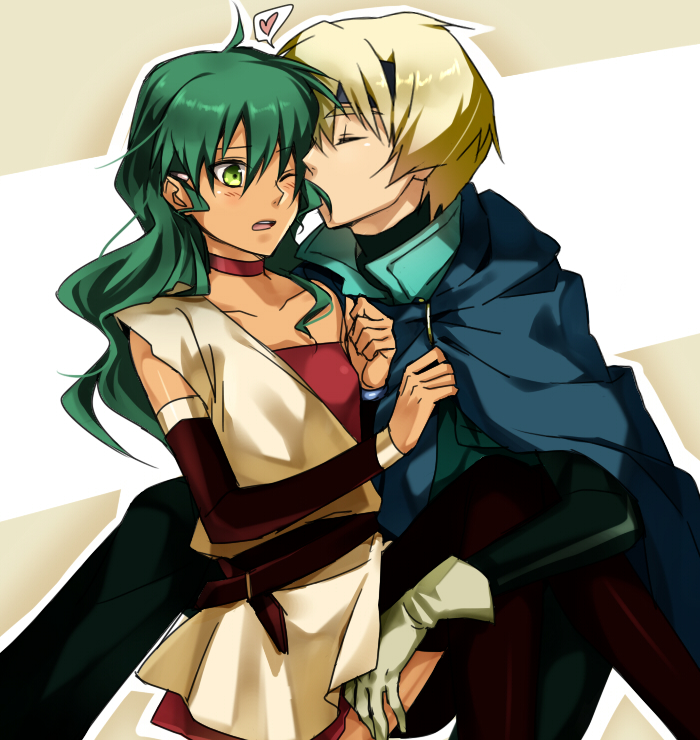 1boy 1girl arm_warmers blonde_hair blue_cloak blue_hairband blue_jacket blush brown_gloves brown_tunic choker clenched_hand cloak closed_eyes deltora_quest facing_to_the_side gloves green_eyes green_hair green_shirt hairband hand_on_another's_thigh hetero inlila jacket jasmine_(deltora_quest) kiss kissing_cheek lief_(deltora_quest) looking_at_another one_eye_closed open_clothes open_jacket pleated_skirt popped_collar red_arm_warmers red_choker red_shirt red_skirt red_thighhighs shirt skirt speech_bubble thighhighs tunic white_background yellow_background
