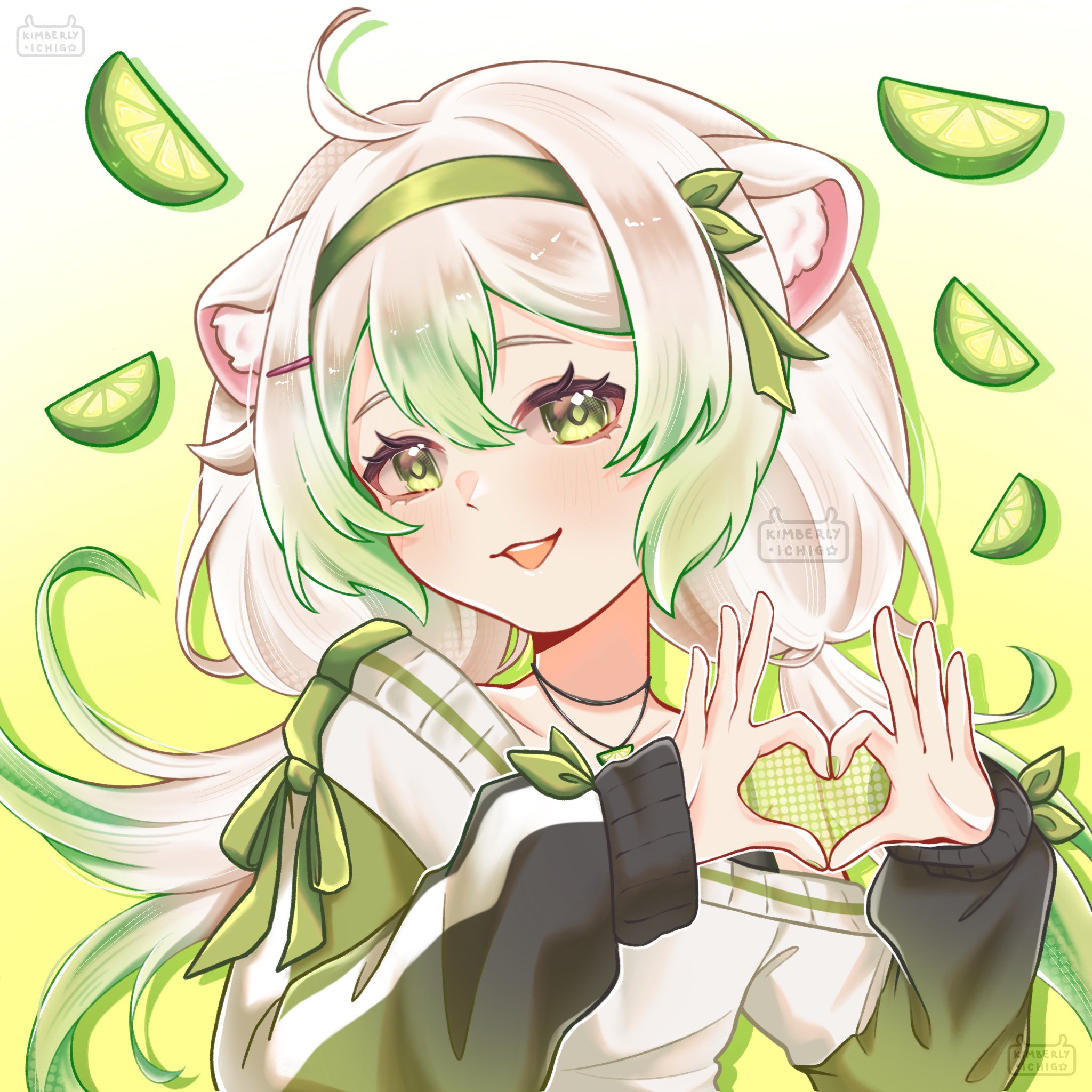 1girl animal_ears bare_shoulders ferret ferret_ears ferret_girl ferret_tail food fruit gradient_background gradient_hair green_background green_eyes green_hair green_nails green_sweater hair_ribbon head_tilt headband heart heart_hands highres indie_virtual_youtuber jewelry kimberlyichigo limealicious limealicious_(cozy) leaf light_smile lime_(fruit) lime_slice looking_at_viewer multicolored_hair necklace open_mouth ribbon smile sweater two-tone_hair vinesauce virtual_youtuber white_hair white_sweater