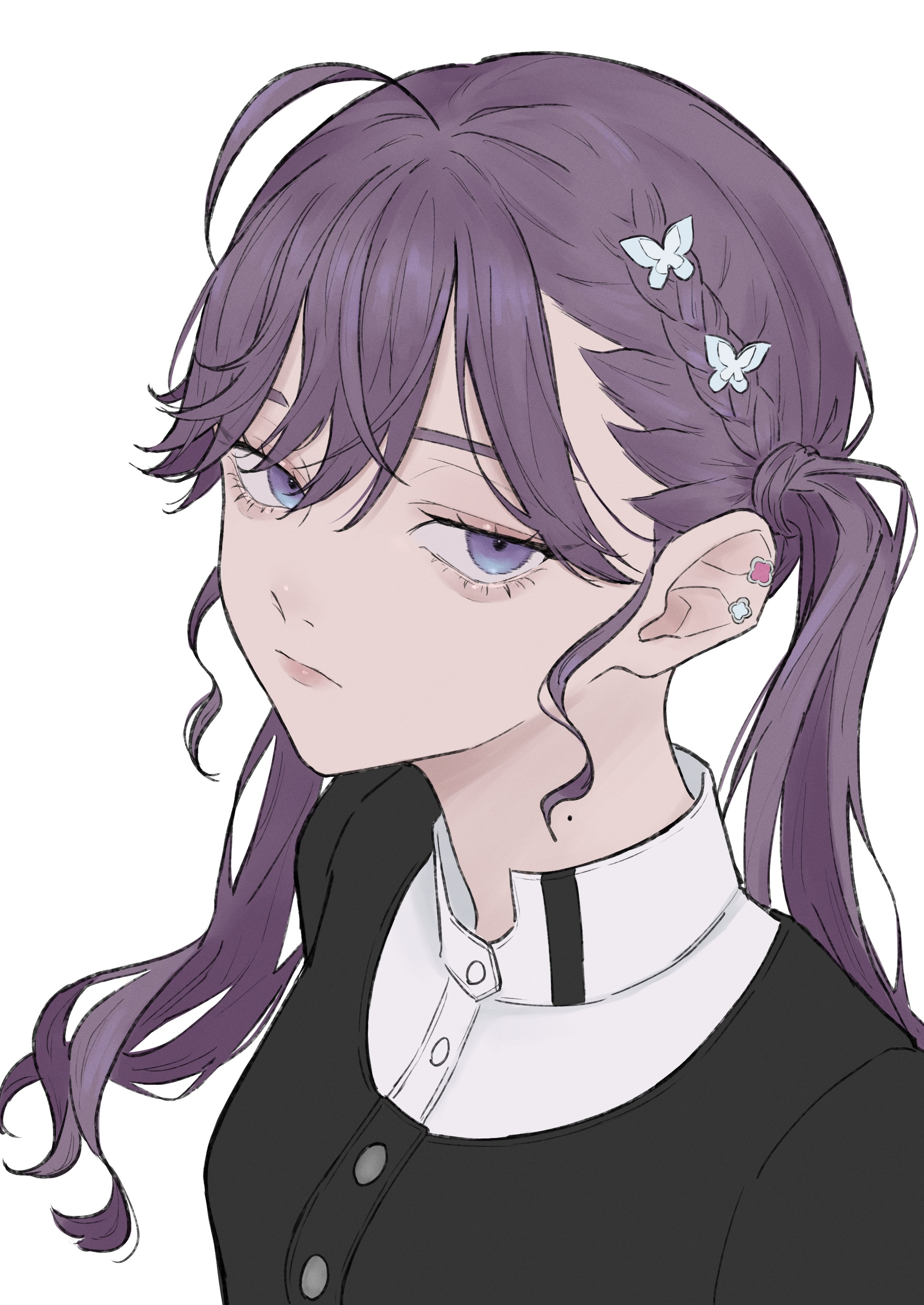 1girl absurdres aegyo_sal ahoge bags_under_eyes black_jacket braid butterfly_hair_ornament commentary ear_piercing expressionless gakuen_idolmaster gokugetsu_gakuen_school_uniform hair_ornament highres idolmaster inase_(1na1000) jacket kaya_rinha looking_at_viewer mole mole_on_neck piercing purple_eyes school_uniform simple_background solo twintails upper_body white_background