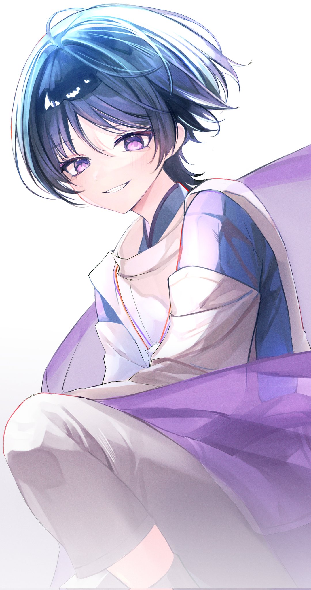 1boy black_hair clothing_cutout eyelashes genshin_impact hair_between_eyes hair_intakes highres japanese_clothes kariginu kimono kneeling layered_sleeves long_sleeves looking_at_viewer male_focus open_mouth pants pink_eyes purple_kimono purple_sleeves purple_veil scaramouche_(genshin_impact) scaramouche_(kabukimono)_(genshin_impact) see-through_clothes see-through_veil side_cutout smile solo v-neck veil white_background white_mouth white_pants white_sleeves yeone35025