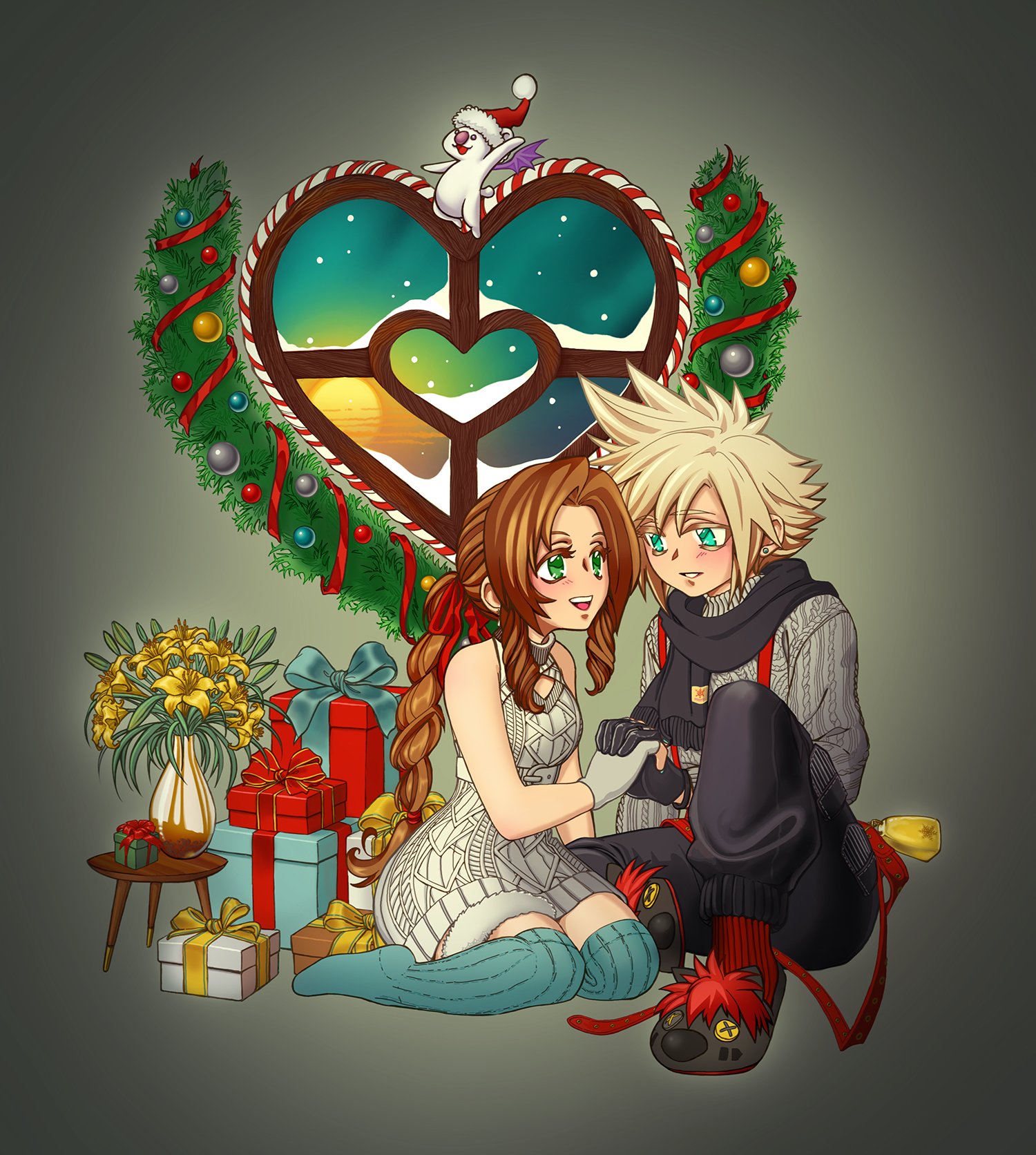 1boy 1girl aerith_gainsborough aerith_gainsborough_(fairy_of_snowfall) animal_slippers aqua_eyes aqua_thighhighs bare_shoulders bell belt black_gloves black_pants black_scarf blonde_hair box braid braided_ponytail breasts brown_hair cable_knit cargo_pants christmas christmas_ornaments christmas_present christmas_wreath clothing_cutout cloud_strife cloud_strife_(holiday_outfit) cowbell dress earrings final_fantasy final_fantasy_vii final_fantasy_vii:_ever_crisis fingerless_gloves flower full_body gift gift_box gloves green_eyes grey_background grey_sweater hair_ribbon hat herzenreine highres holding_hands interlocked_fingers jewelry kneeling knit_sweater lily_(flower) long_hair medium_breasts moogle multiple_belts no_shoes official_alternate_costume open_mouth pants parted_bangs parted_lips red_belt red_hair red_ribbon red_xiii red_xiii_(the_hellhound) ribbon santa_hat scarf short_hair sidelocks single_braid single_earring sitting slippers smile snow spiked_hair sunset suspenders sweater sweater_dress thigh_strap thighhighs vase white_gloves wreath yellow_flower