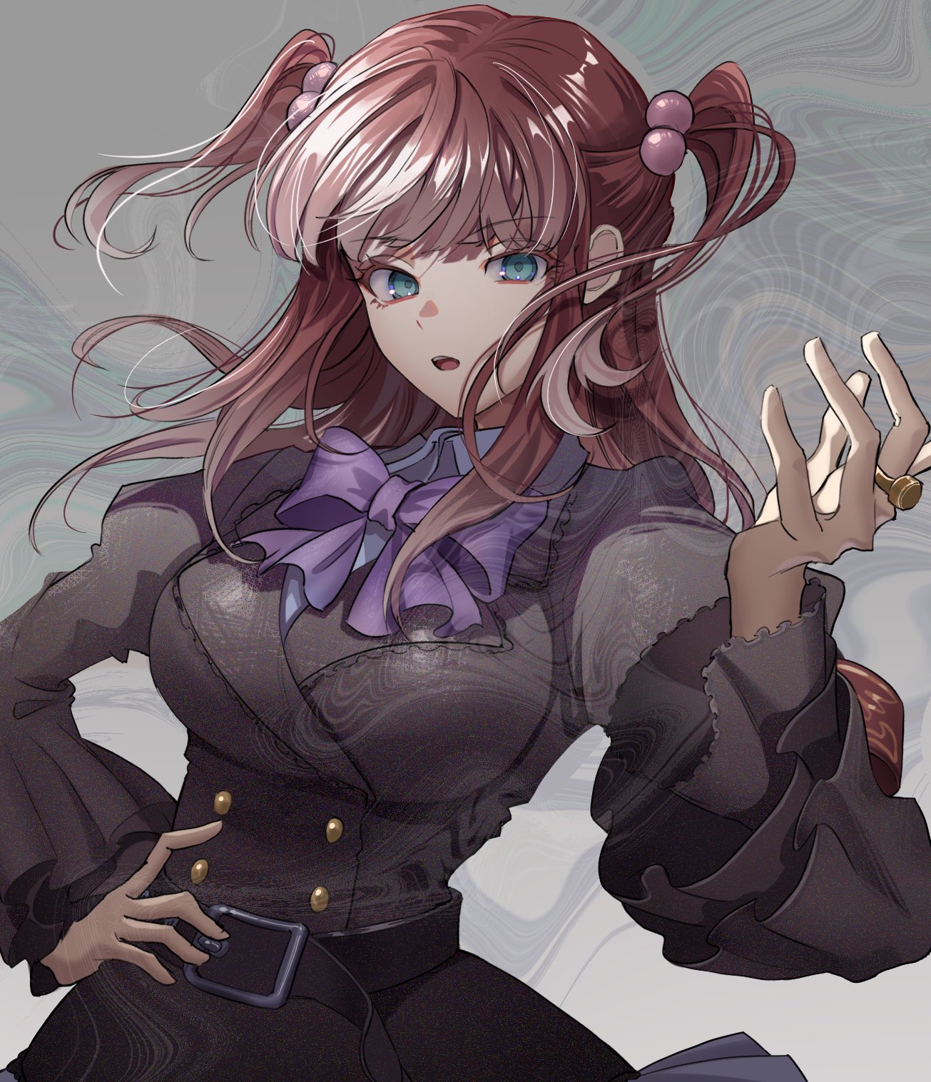 black_dress blue_eyes bow dress highres jewelry long_hair looking_at_viewer open_mouth purple_bow red_hair ring soresono88 twintails umineko_no_naku_koro_ni ushiromiya_ange