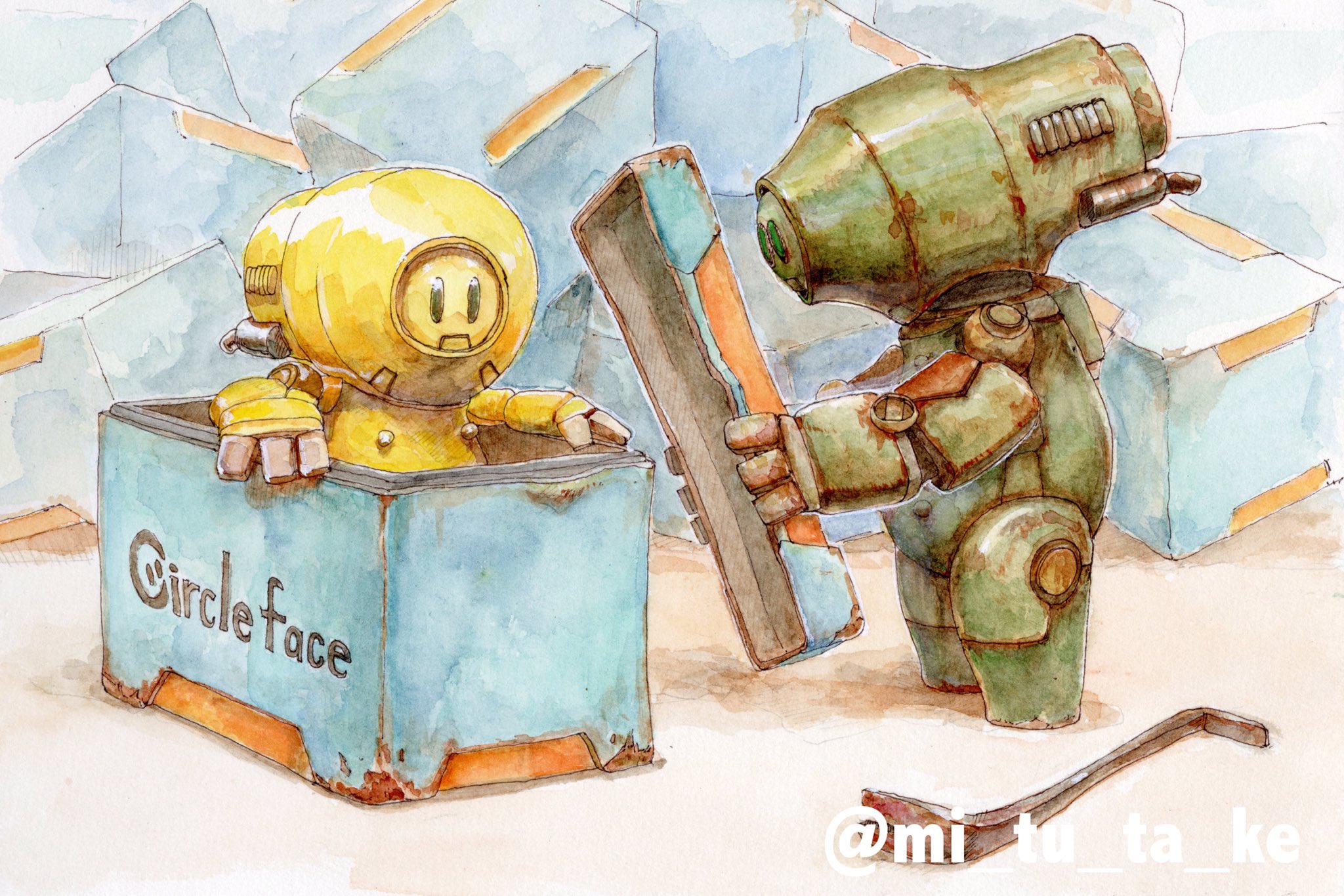 0_0 box crowbar english_text highres mechanical_arms mechanical_legs no_humans no_mouth original robot rust tagme tsuboi_hajime twitter_username