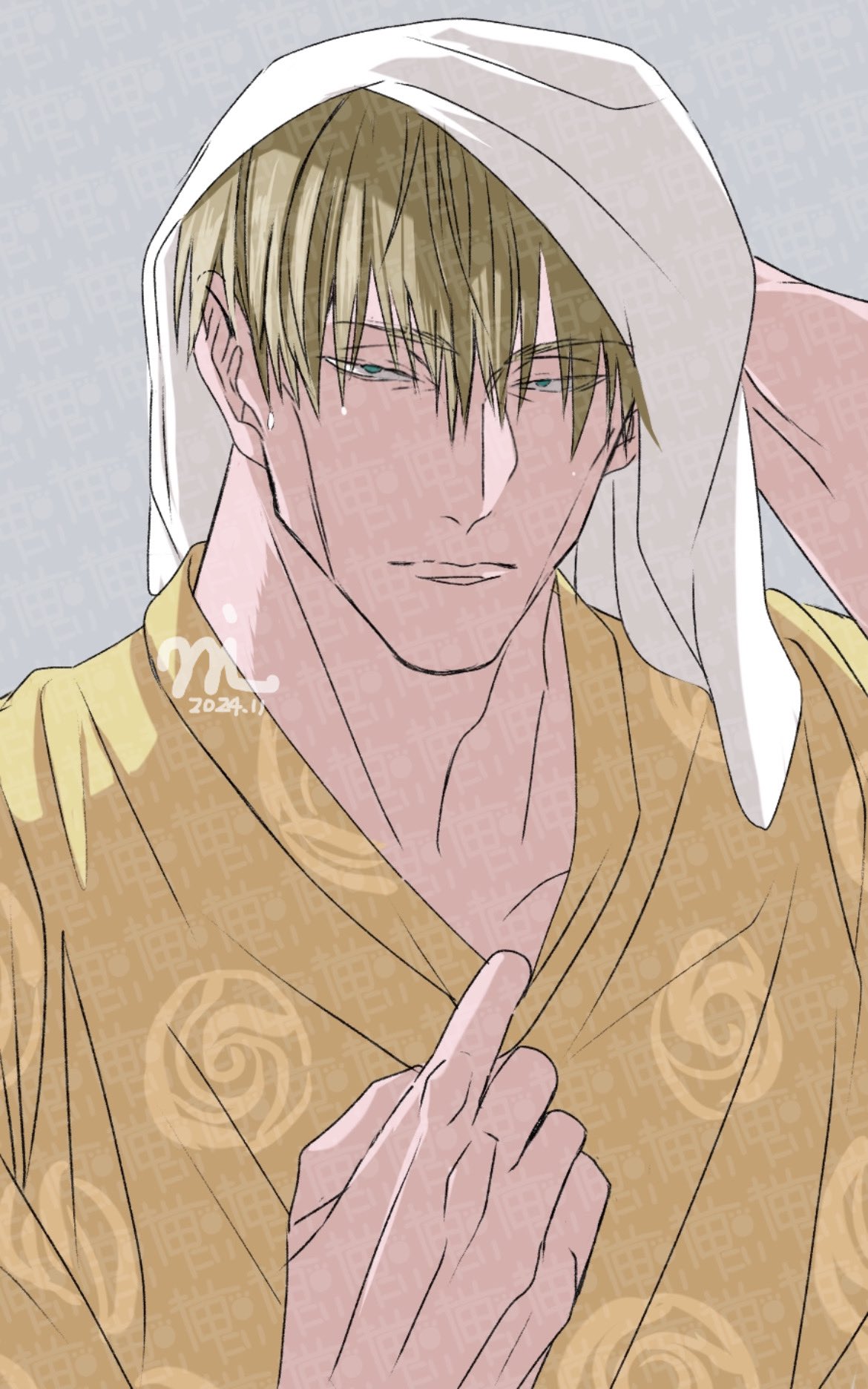 alternate_eye_color blonde_hair blue_eyes grey_background highres japanese_clothes jujutsu_kaisen kimono looking_at_viewer male_focus nanami_kento nekonii short_hair solo towel towel_on_head upper_body yellow_kimono