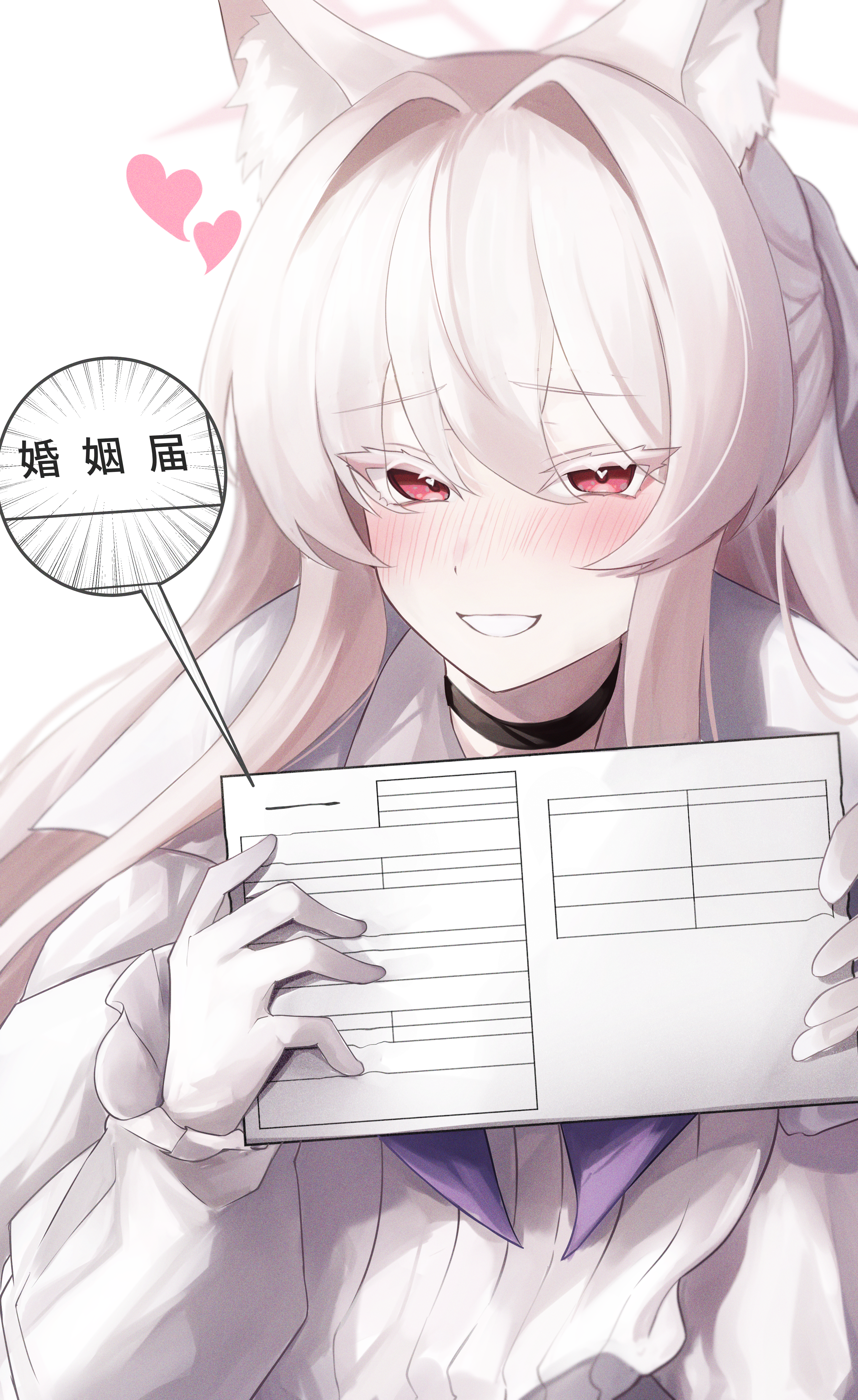 1girl :d absurdres akira_(blue_archive) animal_ear_fluff animal_ears black_choker blue_archive blush cat_ears cat_girl choker colored_eyelashes commentary_request gloves grin hair_between_eyes hair_intakes half_updo hands_up heart heart-shaped_pupils highres holding holding_paper long_hair long_sleeves looking_at_viewer marriage_certificate_(object) nose_blush oiru_(613) open_mouth paper puffy_long_sleeves puffy_sleeves red_eyes simple_background smile solo speech_bubble symbol-shaped_pupils tsurime upper_body white_background white_gloves white_hair