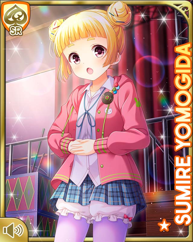 1girl :o blonde_hair blue_neckwear blue_skirt card_(medium) character_name day double_bun girlfriend_(kari) hair_bun hood hoodie indoors jacket looking_at_viewer pantyhose petticoat pink_jacket plaid_clothes plaid_skirt purple_eyes purple_pantyhose qp:flapper school_uniform shirt skirt solo white_shirt yomogida_sumire