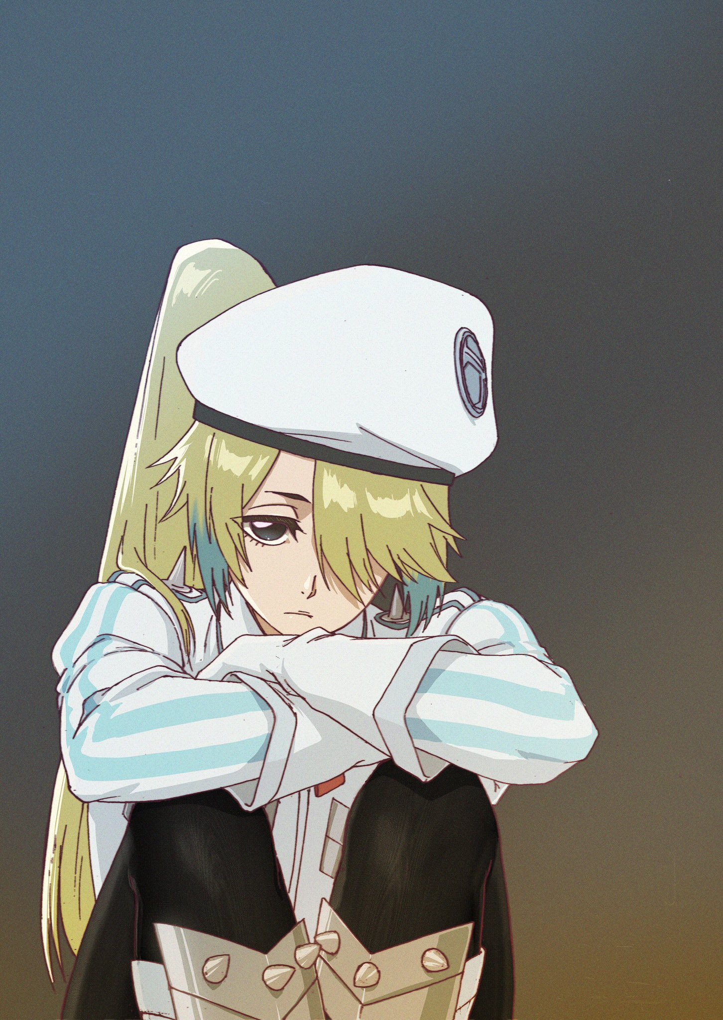 1girl bleach bleach:_sennen_kessen-hen blonde_hair boots chan_dali female_focus gloves hat highres knee_boots long_hair looking_at_viewer military_hat multicolored_hair nikita_deathlock ponytail quincy_(bleach) simple_background sternritter two-tone_hair white_gloves
