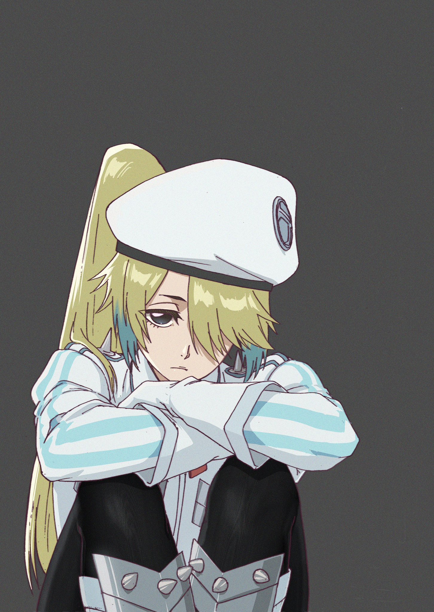 1girl bleach bleach:_sennen_kessen-hen blonde_hair boots chan_dali female_focus gloves grey_background hat highres knee_boots long_hair looking_at_viewer military_hat multicolored_hair nikita_deathlock ponytail quincy_(bleach) simple_background sternritter two-tone_hair white_gloves