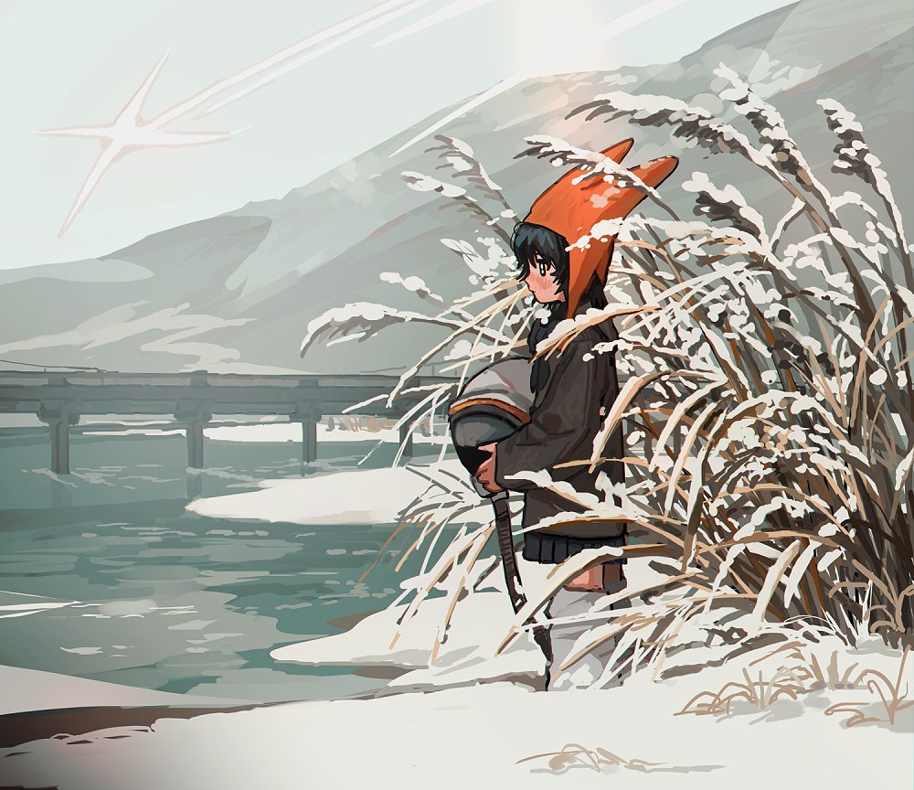 1girl black_eyes black_hair black_skirt black_sweater bridge hair_between_eyes hat holding leg_warmers light_blush looking_to_the_side myango_(applemangocrape) orange_hat original oversized_clothes shooting_star sketch_background skirt snow sweater water wheat white_leg_warmers