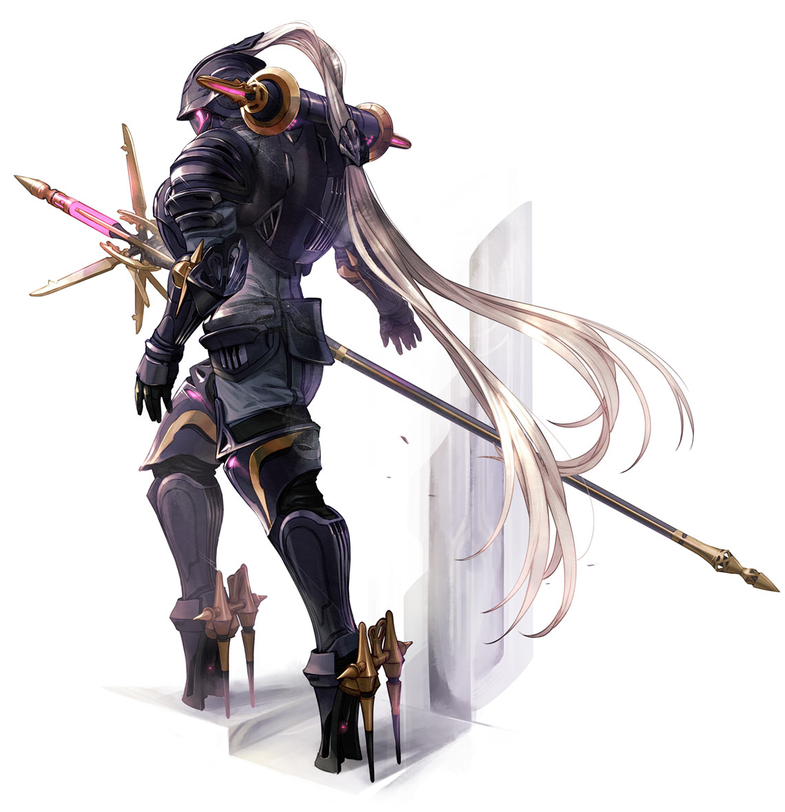 1girl armor armored_boots black_armor black_boots boots breastplate dianthus_(harvestella) full_body gauntlets glowing harvestella helm helmet high_heels official_art polearm robot solo spear third-party_source weapon yasushi_hasegawa